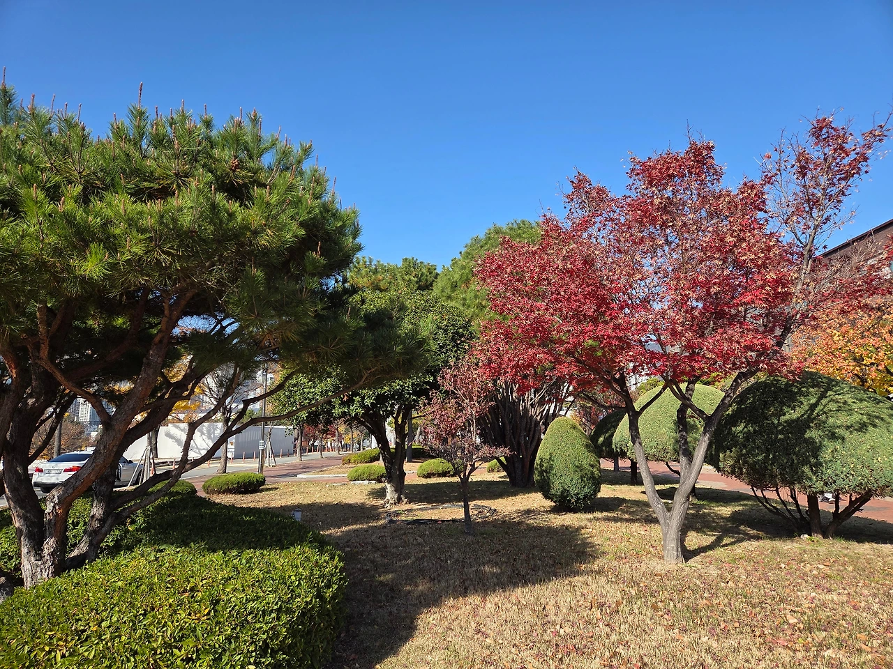 문득 고개를 들어보니, 시리도록 파란 하늘 아래 두 계절이 나란히 서 있네요.