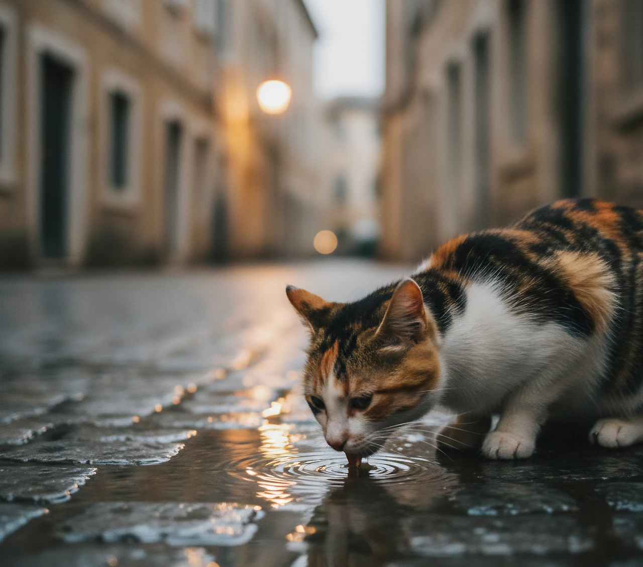 비가 지나간 뒤, 차가운 돌길 위에 고인 작은 물웅덩이가 문득 거울이 되는 순간이 있다. 저 작은 생명은 그저 목을 축이는 것이 아닐지도 모른다. 문득 이런 생각이 든다. 자신의 가장 연약한 부분을 기울여, 물 위에 비친 흔들리는 세상의 빛과 입맞춤하는 것은 아닐까. 그 작은 파동이 고요한 수면을 깨우듯, 우리의 건조한 일상에도 뜻밖의 다정한 순간이 찾아와 마음을 적신다. 주저앉아 들여다보아야만 비로소 보이는, 낮고 투명한 위로들이 이 거리에 가득하다.