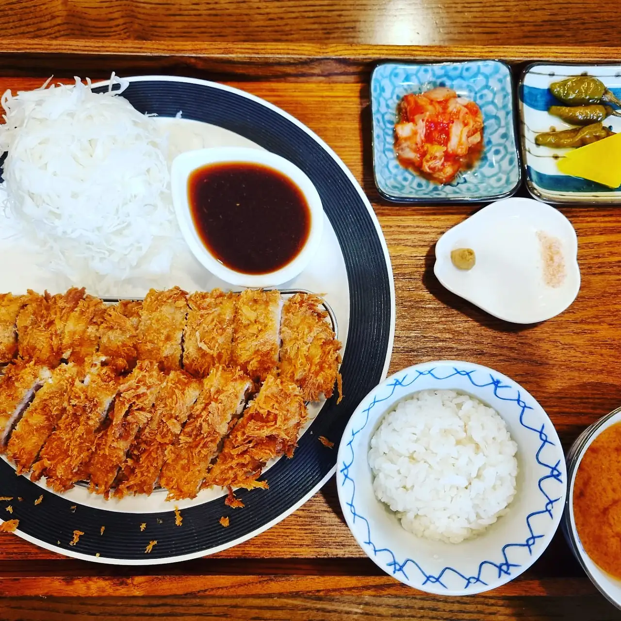 좋은 때깔을 위해 선택한 메뉴는 안심과 등심을 모두 먹을 수 있는 반반카츠 A. 위로는 안심이요 아래로는 등심이 한 줄씩 총 2줄이 나온다. 두 카츠 모두 부드럽되 살코기의 식감과 육향이 풍기는 안심과 기름으로 고소한 풍미가 매력적인 등심이 각각의 매력을 제대로 보여준다. 이 와중에 겨자와 소금이 카츠와 궁합이 좋다. 찌르르한 첫맛으로 식욕을 돋우는 겨자는 안심의 육향과 등심의 고소한 풍미를 돋보이게 해준다. 코를 ‘확’ 뚫어주는 와사비와는 달리 말 그대로 입맛을 순간적으로 돋워줘 한 입 한 입을 즐겁게 해준다. 소금의 짭짤한 맛은 카츠와 함께 입에 들어오는 순간 단맛처럼 느껴진다. 카츠의 바삭한 식감 사이로 짠맛과 단맛 그 사이의 맛이 관통해 맛의 변화가 즐겁다.