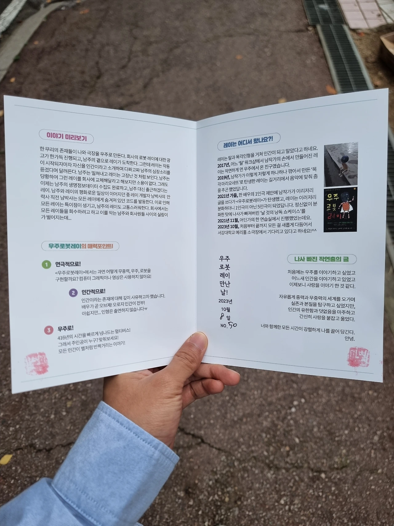 "애초부터 인간'인' 것이 아니라 '될' 수 있는 것이라면 무엇으로 어떻게 될 수 있는가?"라는 물음에서 시작한 듯한 레이의 우주 여행은 시간을 연극적으로 재배치하고 조립하면서 인간과 인간성을 향해 묵묵히 나아간다. 하지만 묵묵한 여정을 버티는 것이 쉽지는 않을 듯하다. 관객과 함께 여행을 떠나기 위해 발칙하게 근원부터 흔들어 놓으며 호기롭게 출발한 여행이 왜인지 힘에 부치는 느낌이다. 그럼에도 이 여행에 관객들이 함께 하길 바라며 동시에 앞으로의 관객들을 위해 이 여행도 다양한 시도를 할 수 있으리라 생각한다. 우주 속 기나긴 시공간을 사이에 두고 남주의 레이와 윤하가 다른 기억들이 서서히 사라지는 유사 죽음의 순간에 서로를 그리워 해 터져나오는 인간성을 관객들도 깊이 빠질 수 있으면 좋겠다. 우리 개개인이 아니라 '나'와 '너'가 함께 하고 있는 이 모든 순간을 인간이라고, 인간성이라고 말하는 듯한 이 여행의 마지막에 온 힘을 다해 도달할 수 있으면 좋겠다. <우주로봇레이>의 첫 출발을 축하하고 앞으로의 우주 여행이 더욱 힘차길 바라며 글을 마친다.