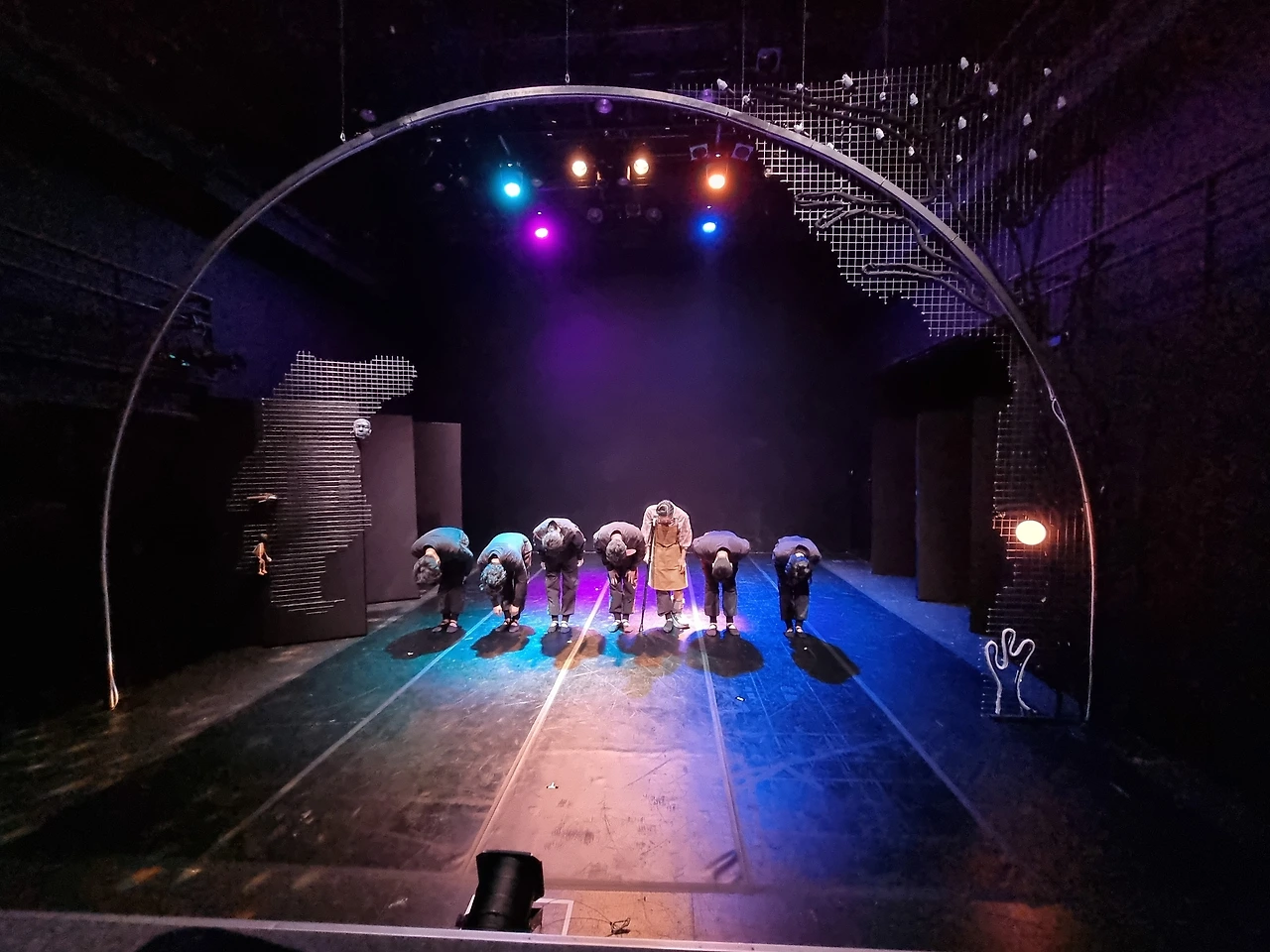 <우주로봇레이>는 발칙하게 공포스럽다. 한 무리의 우리가 등장해 연극의 규칙에 대해서 말한다. "우리는 레이이면서 레이가 아니다!" 우주를 떠도는 로봇 레이에 대한 이야기라 해놓고는 관객에게 극장 내 모두가 레이이면서 레이가 아니라고 하다니. 의식적으로든 무의식적으로든 근원에 대해 질문하는 우리 모두에게 공연 시작 전부터 레이이되 레이가 아니라니! 관객을 존재에서부터 흔들려는 로봇 레이의 수작이렷다! 암전이 된 이후에도 스스로를 레이라고 했다가 아닐 수도 있다는 말과 함께 로봇 레이의 수작은 계속된다. 인간의 노동을 완전히 대체한 로봇 레이는 인간을 계속해서 존재부터 흔든다. 남주의 노동을 대신하기 위해 배송된 레이는 처음 작동한 순간 "나는 인간이에요"라고 말한다. 처음 눈을 뜨자마자 자신을 인간이라 지칭하는 존재에게 대놓고 자신이 인간이라고 선언하다니. 잠깐의 해프닝으로 넘어갈 수 있을 이 선언은 인간이되 인간이 아닌 우리의 불안한 상태를 상기시킨다. 사실 생각해보면 그렇다. 우리가 우리를 먼저 인간이라 지칭했을 뿐 사실 누구나 스스로를 인간이라 지칭할 수 있다. 누구나 인간이 될 수 있다는 가능성. 우월한 위치에 있는 이들은 언제나 추락의 불안을 가지고 있다는 점에서 이 연극은 불안으로 시작한다.