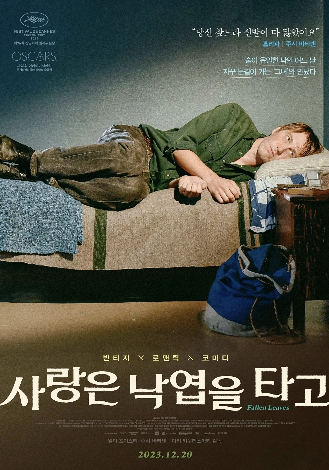 개인적으로 <사랑은 낙엽을 타고>는 이후로 떠올릴 때면 가장 먼저 영화에 대한 첫 인상부터 생각나는 영화이다. 돌이켜 보면 혼자 피식 웃음이 나오는 인연을 영화와 맺었다 여겨진다. 처음 <사랑은 낙엽을 타고>를 알게 된 것은 영화 모임에서 만난 바 있던 한 분의 별그램 스토리를 통해서이다. 당시 본 스토리에는 원제가 Fallen Leaves 즉, "낙엽"인 북유럽 영화를 담백하게 번역한 것이 아니라 "대추나무 사랑걸렸네"처럼 한국식으로 번역한 것에 통탄하는 내용이 있었다. 스토리를 보면서 마찬가지로 통탄해했다. 어찌 됐든 영화가 대중문화로서 자본과 밀접하게 연관되어 있다고 하지만 "낙엽"을 "사랑은 낙엽을 타고"로 번역한 것은 지나치게 현지화한 것으로 원작에 대한 최소한의 예의가 없다는 생각이 들었기 때문이다. 일종의 낚시성 번역으로 어떻게든 관객을 끌어들일 수 있다면 상관없다는 태도로 느껴졌다. 그래서인지 영화관에서 관람할 당시 번역에 대한 첫 인상으로 인해 걱정이 앞선 상태로 봤던 기억이 난다. 하지만 재밌게도 영화관을 나서면서 제목 번역을 참 기깔나게 잘했다는 생각이 들었다. <사랑은 낙엽을 타고>는 대추나무에 걸린 사랑을 낙엽에 실어 관객에게 전달하는 종말 배경의 북유럽풍 뮤지컬 로맨스 코미디 영화였던 것이다.
