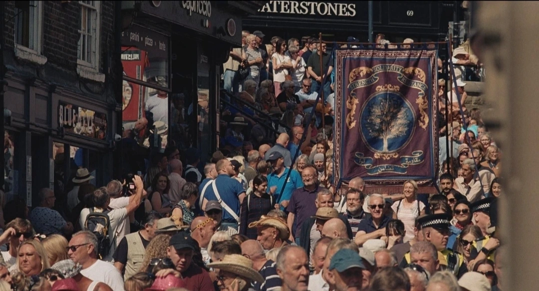 다음 순간 구렁텅이로 던져진 국제적 연대 공동체는 야라의 부친 사망 소식을 통해 다시 한 번 비약의 순간을 맞이한다. 살아있을 것이라는 희망을 넘어 아직 살아있다는 소식까지 들려왔던 부친이 결국 사망했다는 소식은 야라가 앞서 느낀 희망을 송두리째 무너뜨린다. 내전을 피해 고국을 등지고 낯선 영국 폐광촌으로 밀려온 이민자들에게 고국으로 돌아갈 수 있다는 혹은 고국이 다시 평화를 되찾을 것이라는 희망은 사라진다. 간신히 차를 집어 들고 울음을 삼키며 우울한 침묵을 맞이한다. 바로 그 순간 바깥에서 누군가 문을 두들긴다. 폐광촌 노동자들이 꽃을 들고와 조의를 표하며 부친의 사진에 인사를 하고 남편이자 부친이자 친구를 잃은 이민자들을 껴안으면서 마침내 울음이 터져나와 우울한 침묵이 깨진다. 터져나온 감정은 서로를 따뜻하게 위로하며 오히려 민족, 종교, 성별, 나이 등을 뛰어넘어 장난도 치고 웃기도 하는 공동체의 장이 된다. 서로를 위한 공동체의 장이 사라졌다 여기며 모든 것이 끝났다고 느낀 패배감과 좌절은 어느새 비약을 통해 여전히 바로 이곳에 과거와 같은 연대의 공동체가 있다는 것을 알려준다. 야라가 T.J.에게 말한다. 슈크란(شكرا). T.J.가 야라에게 말한다. 슈크란(شكرا).