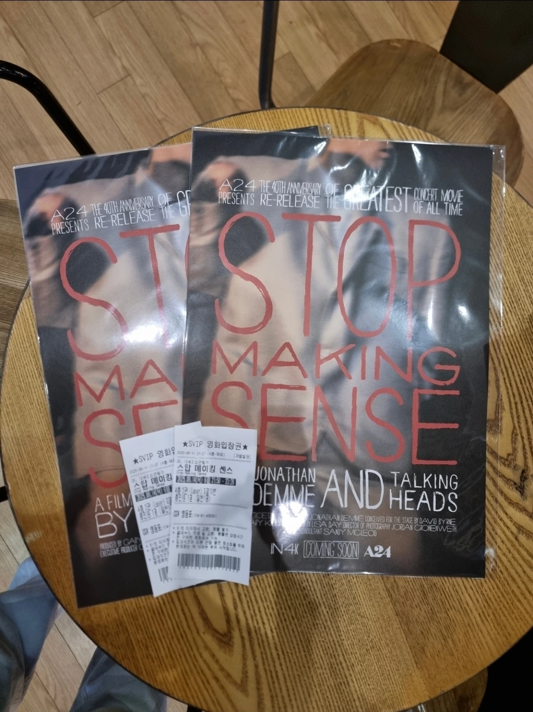 영화를 보다 보면 자신도 모르게 발을 구르고 어깨춤을 들썩일 때가 있다. 영화의 음악을 듣다 '아, 이 음악 좋다!'하고 인식하고 들썩이는 것이 아니라 이미 들썩이고 있고 '이 음악 좋다!'하며 인식이 뒤늦게 쫓아온다. 4K 리마스터링으로 재개봉한 1984년작 <스탑 메이킹 센스>가 그렇다. 정말 한 순간이었다. 아무도 없는 텅 빈 공연장. 공연 준비 자체가 시작도 안 되어 날 것 그대로의 공연장의 무대 위로 록밴드 토킹 헤즈(Talking Heads)의 데이비드 번이 올라왔다. 아무것도 없는 무대 위에 선 데이비드 번의 한 마디. "안녕하세요, 테이프 하나 틀게요." 그 말을 시작으로 곡이 진행되고 무대에 무대 장치와 멤버들이 하나, 둘 들어와 무대가 완성되기 시작한다. 완성되기까지의 곡, 완성된 이후의 곡 모두 아는 노래는 단 하나도 없다. 애초에 토킹 헤즈라는 밴드도 영화를 통해서 처음 알게 됐다. 그럼에도 단 한 순간도 쉬지 않고 스크린에서 넘어오는 밴드의 노래는 발과 팔을 쉴 새 없이 움직이게 한다. 함께 간 이가 없었더라면 차오른 흥분을 멈추지 못하고 쉴 새 없이 노래에 몸을 맡겼을 것이다.