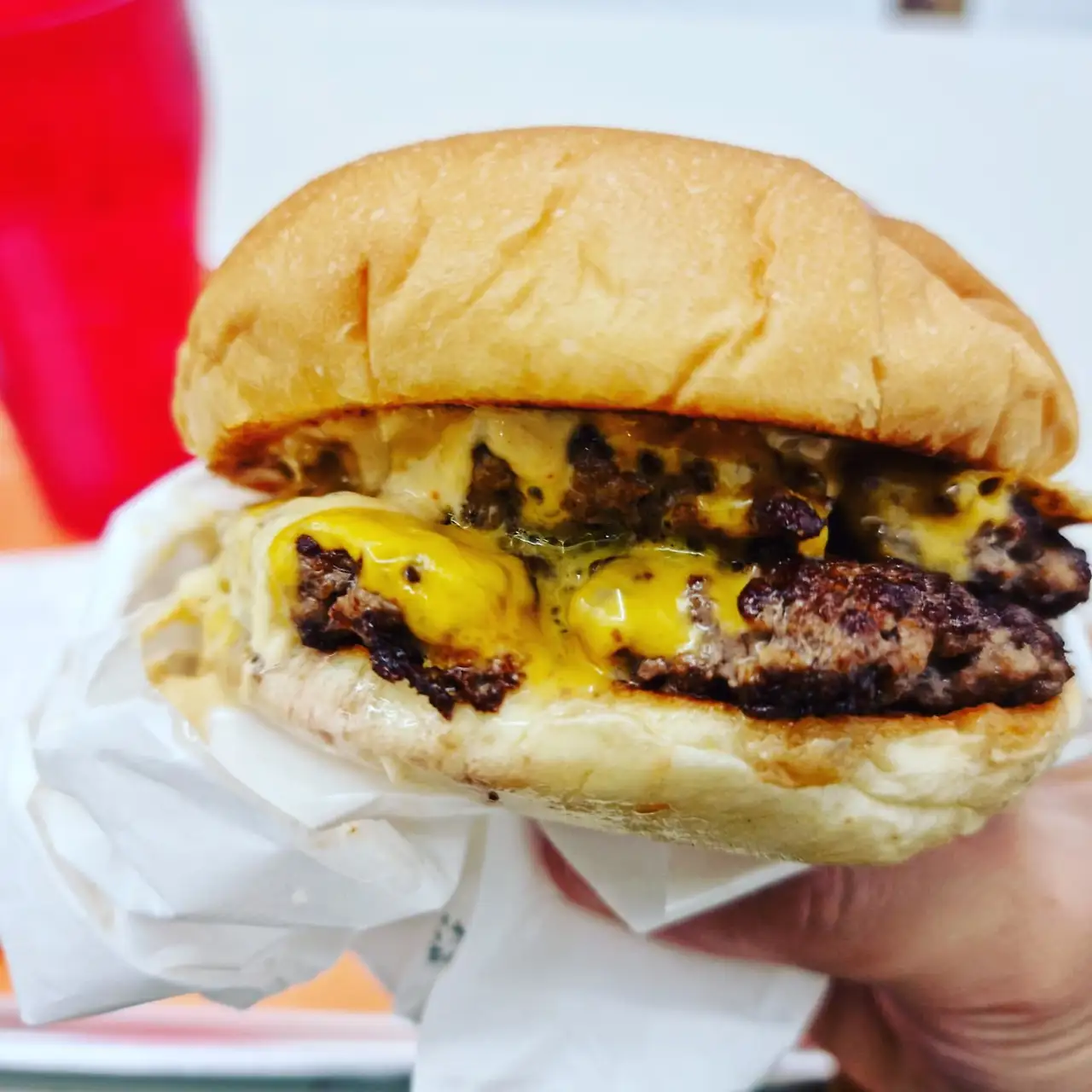 하지만 분위기에서 느낀 기분은 앞서 말했듯 음식을 보면 당황을 넘어 '이것은 버거인가?'이라는 존재론적 질문에 도달한다. 아니 가게 이름이랑 너무 다른 거 아... 패티 2장과 치즈 2장의 감칠맛에 기대감 보다 더 컸던 의구심이 언제 있었냐는 듯 사라지고 대신 치즈버거 자체가 자리잡는다. 패티에서 올라오는 육향과 불향이 치즈의 고소함과 만나 여태까지 먹은 치즈버거들이 모두 잊혀진다. 채소도 없어서 소고기의 고소함, 육향과 불향, 치즈의 고소함이 막힘 없이 들어온다. 후각을 자극하던 향이 혀를 시작으로 온 몸을 자극하며 퍼져나간다. 채소 없이 탄, 단, 지를 먹으니 죄책감이 올라올 만도 한데 그냥 밀려 들어온다. 하지만 억지로 밀고 들어오는 느낌이 아니다. 밀어붙이는 대로 입이 저절로 열린다. 패티와 치즈가 죄책감을 느낄 때가 아니라 어서 더 먹기나 하라는 듯 죄책감을 싹부터 잘라버린다. 패티의 육즙과 녹아내린 치즈까지 쥬시하게 들어와 다른 생각을 못하게 한다. 오죽하면 버거 먹을 때 항상 함께 마시는 콜라마저도 잊어버렸다.