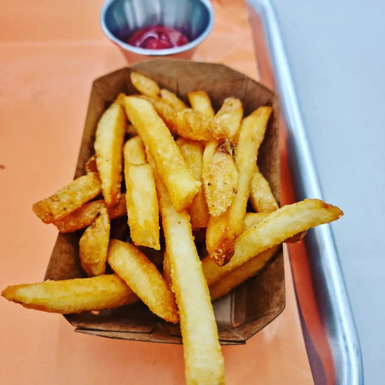 가게 외관과 내관은 모던한 미국 서부 바 같은 느낌이다. 카운터를 기점으로 홀과 부엌이 다른 세상 같다. 마치 과거의 깨끗한 서부 바의 부엌에서 현대의 모던한 홀로 버거가 넘어오는 기분이다. 그 와중에 형형색색으로 빛나는 음료 냉장고는 천국처럼 보인다. 세차게 겨울 바람이 불고 있음에도 냉장고에서 차가운 음료 하나를 꺼내 마시게 하는 화려함이다. 홀은 준비에 꽤나 힘쓴 야외 캠핑장의 깔끔한 식사 장소 같다. 검은 철제 몸을 지닌 하얀 의자와 탁자가 깔끔하게 정돈되어 있다. 손님이 북적인다면 사람 많은 캠핑장에서 활력 넘치는 에너지가 공명을 일으키는 것처럼 식당의 분위기도 활기로 가득 찰 것 같다. 자기 손보다 큰 햄버거를 와구와구 먹는 아이를 보며 이런 저런 얘기를 하고 있는 4명 단체 손님 석만으로도 아이의 모습에 괜히 미소가 지어지고 손님들의 얘기를 배경음악 삼아 기다리는 재미가 있다. 아, 시국이여 언제 끝나는가.