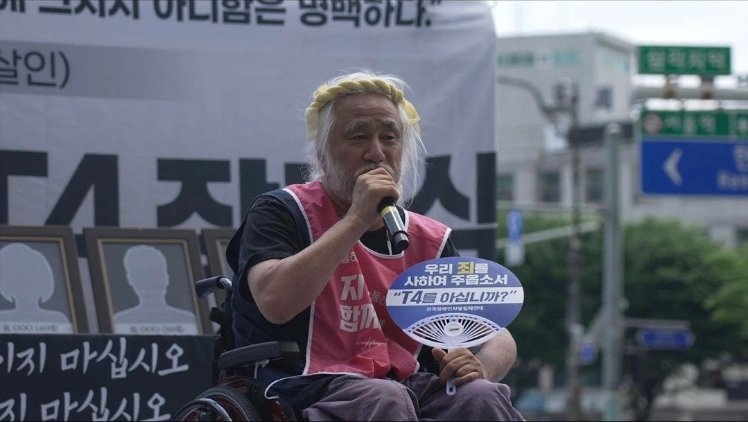이러한 튜터링의 경험으로 인해 <스탠바이, 액션!>은 DMZ IDFF 홈페이지에 게시된 영화 소개와 대표 스틸을 보자마자 빼놓을 수 없는 영화였다. 장애인 이동권 시위와 세월호 참사 시위를 오고가는 <스탠바이, 액션!>은 故 박종필 감독을 매개로 두 운동을 연결하면서 스크린 너머 관객과 연대하려는 시도를 한다. 장애인, 빈민, 노숙인 등 사회적 약자들의 삶과 운동을 카메라에 담았다는 故 박종필 감독을 잘 알지는 못한다. 영화를 보면서 처음 알게 된 영화인이자 운동가이다. 다만 그가 여전히 해결되지 않은 장애인 이동권 시위와 세월호 참사 시위, 나아가 가장 최근의 이태원 참사 시위에 이르기까지, 그 이전 국가에 의해 지움을 강요당한 IMF 실직자, 노동 빈민 등을 기억하기 위해 카메라를 들었음을 알 수 있다. 즉, <스탠바이, 액션!>은 국가에 의해 계속해서 지워지고 있는 사회적 약자들의 연대를 기록한 영화이다. 故 박종필 감독의 의지를 계승한 장애인 이동권 시위를 이끄는 전국장애인차별철폐연대 상임공동대표 박경석 운동가와 세월호 참사 피해자의 아버지이자 다큐멘터리 영화감독 문종택 감독이 계속해서 국가의 지움에 저항하는 모습을 담고 있다.