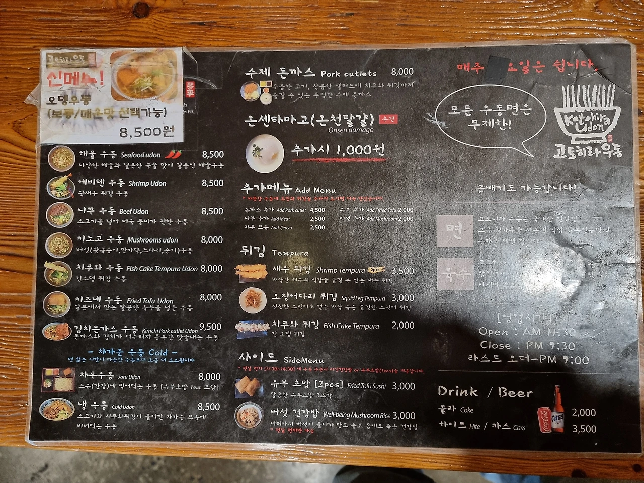 첫 방문이 2019년 3월 11일. 그 때는 봄이라서 우동을 먹으러 갔나 보다. 뭐 봄이나 가을이나 결국 뭔가 센치해지는 계절이니 퉁칠 수 있지 않겠나? 당시에는 치쿠와 우동, 한국어로는 어묵튀김 우동을 먹으며 센치한 봄을 따뜻한 봄으로 바꿨다. 그러고 보니 19년 봄도 겨울이 끝나고도 여전히 추워 이제 정말 한국은 여름과 겨울 밖에 없는 거 아니냐고 했다. 2년이 지난 21년 가을은 하루 덥고 하루 춥고를 왔다 갔다 해 지구 멸망의 날이 얼마 안 남은 게 아닐까 하는 생각을 했다. 이렇게 대학원이 위험하다. 종말이 다가온다는 생각을 찬 밤바람에 날려 보내며 반지하인지 1층인지 애매한 식당으로 들어갔다. 2년 전과 변한 것이 없는 것을 보니 안심이 된다. 언제 종말을 생각했냐는 듯 오늘 먹을 우동을 고민하다 커다랗게 올라간 새우튀김에 홀려 에비텐 우동을 주문한다. 새우튀김이 종말을 이긴다.