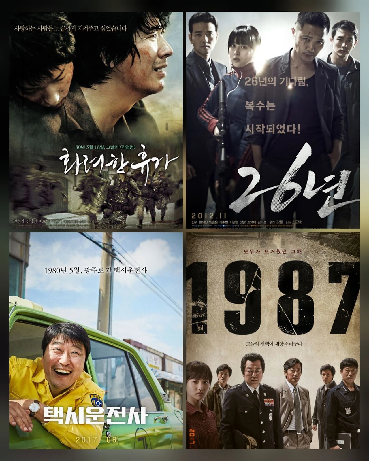 <화려한 휴가>, <26년>, <택시운전사>, <1987>은 모두 1980년대 그 중 12.12 사태 직후 신군부 독재 체제, 광주민주항쟁, 고인이 된 전두환을 다루고 있다. 한국 근현대사에서 1980년대는 1979년 10월 26일 박정희 대통령 암살 사건 이후 드디어 한국에도 민주주의가 가능할 것이라는 국민의 염원이 1979년 12.12 사태로 인해 완전히 박살나면서 다시 독재를 맞이한 시기이자 1987년 6월 민주항쟁을 통해 최초로 민주주의를 맞이한 시기이다. 한국 민주주의 역사에서 가장 격동적인 시기인 것이다. 이러한 1980년대의 시기를 <화려한 휴가>는 광주민주항쟁과 군부 정권의 잔인성을, <26년>은 아직도 청산하지 못한 1980년대 전두환 정권의 잔재에 대한 남겨진 이들의 한을, <택시운전사>는 광주민주항쟁을 거치면서 한국 민중이라는 공동체로 나아가는 택시 운전사 평범한 개인의 성장을, <1987>은 독재에 저항하는 집단으로서 한국인의 민주주의에 대한 염원과 행동을 다루고 있다. 완성도는 잠시 차치하고 네 영화는 공통적으로 감성에 기반해 한국 민중이라는 공동체의 과거에 대한 위령제라고 할 수 있을 것이다.