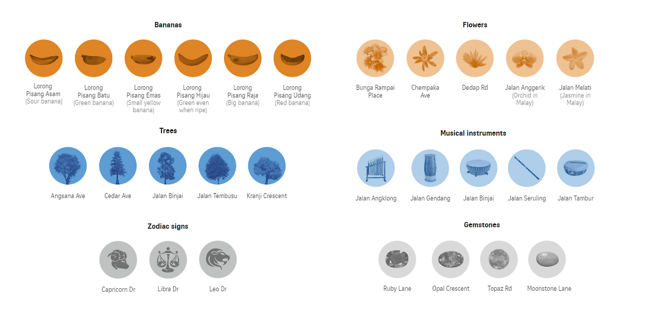 여기서 재미있는 부분은 말레이어로 된 길 이름들이다. 말레이어로 된 거리 이름들은 주로 과일, 원석, 심지어 별자리 이름까지 테마별로 그룹화되어 있다. 예를 들어, 한국분들이 많이 거주하는 지역 중 싱가포르 Beauty World 라는 동네에는 전 세계 존재하는 모든 바나나 종류의 이름으로 거리 이름이 지어졌다. 살짝 덜 익은 바나나부터 빨간 바나나까지, 동남아 여러 곳을 여행한 나로서도 이렇게 많은 바나나가 있고, 또 다른 이름으로 불리우는지도 처음 알게 되었다. 아직 이 '바나나 길'들을 실제로 가보지는 않았지만, 그리고 길 자체가 바나나가 익는 순서로 발전된 모습은 아니겠지만, 한 번 쯤 산책을 가보는 것도 나쁘지는 않을 것 같다.