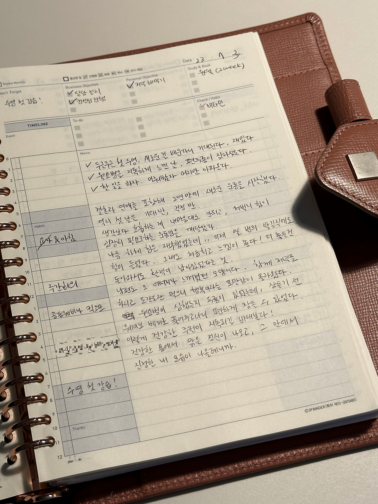 세 달 정도스몰스텝을 실천했다. 꾸준히 무언가 기록해본 경험은 꽤나 큰 성취감을 안겨주었다. 이 성취감은 의미가 있다. 기록을 잠시 멈추거나, 해빗트래커에 동그라미가 없더라도 괜찮았다. 다른 누구와도 비교하지 않고, 온전히 나의 어제와 오늘을 마주하며 써내려간 것이므로 그 마저도 스몰스텝의 과정인 것이다. 가장 인상적인 것은 스몰스텝을 실천하기 전과 비교해 단 10~20분 조금 더 일찍 일어났을 뿐인데, 작은 의식(세 줄 일기 또는 독서)이 하루를 대하는 태도를 바꿔놓았다는 것이다.
