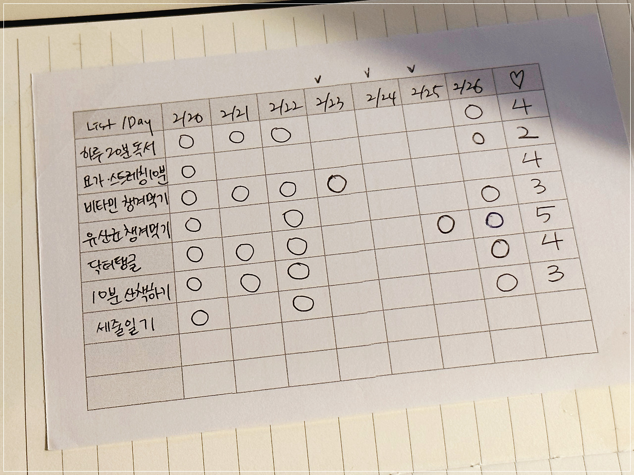 ✔ 매일 실천하고픈 항목들을 적는다. 나의 경우 취미, 건강, 기분 전환을 위한 카테고리로 나눴다.