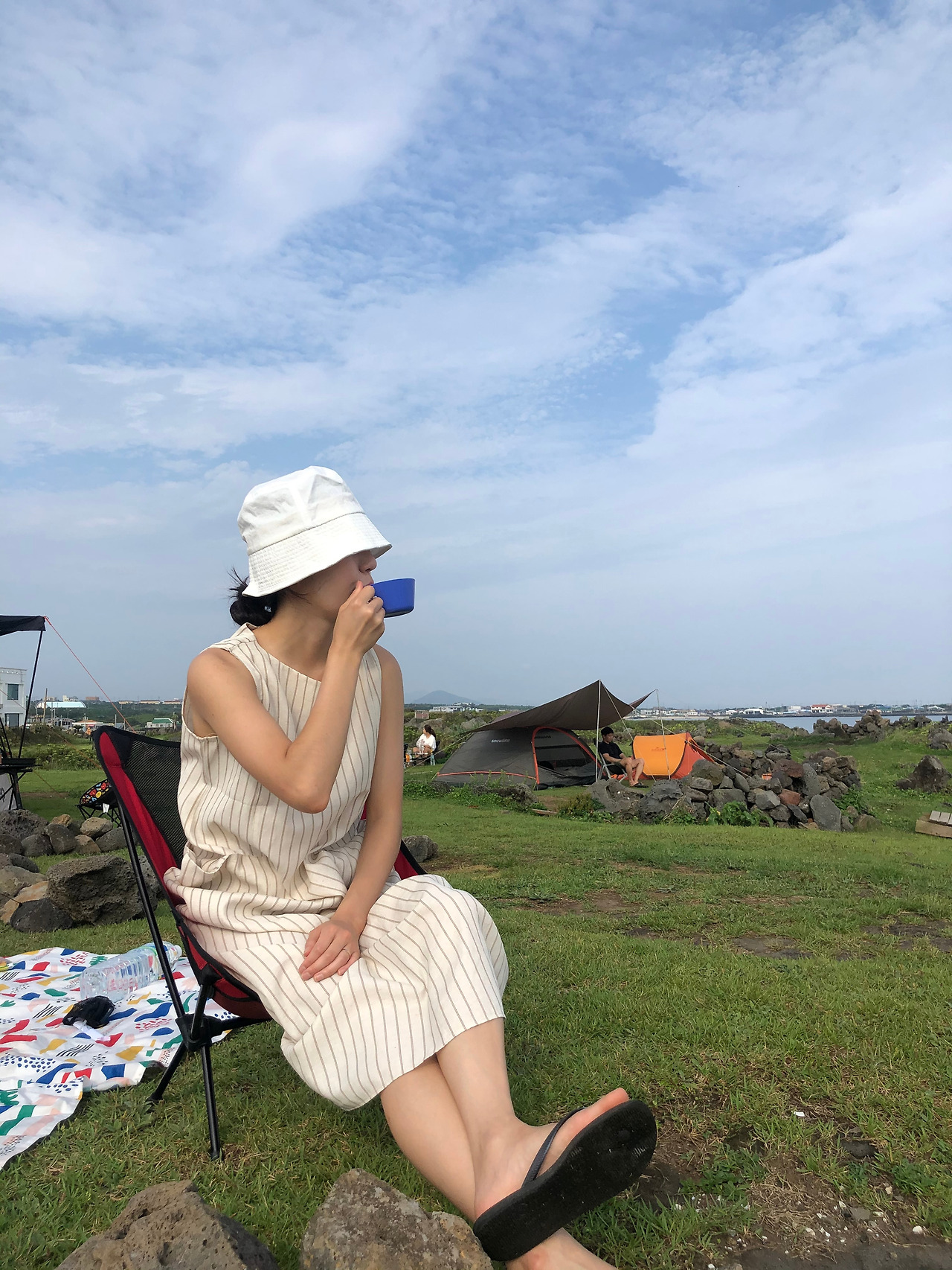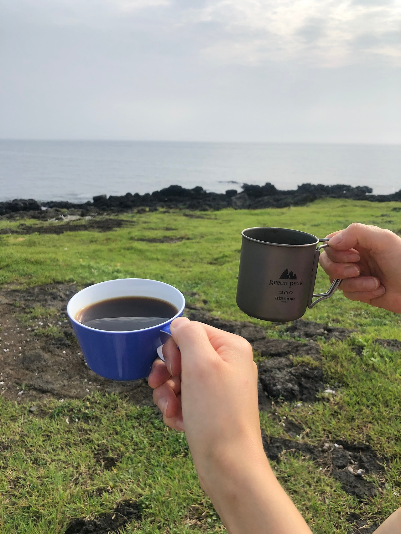 함덕으로 향하니 날씨가 개였다. 물이 빠진 함덕 서우봉 해수욕장은 가족들이 다정하게 시간을 보내고 있었고, 엄마가 꼭 해보고 싶어했던 서핑을 하는 사람들도 있었다. 5분만에 텐트를 치고, 샤워실에서 샤워를 했다. 그리곤 차가워진 몸을 뎁히기 위해 커피를 한 잔 했다. 물놀이에 찬물샤워에 많은 일들에 조금 지쳐있었다. 커피를 마시면서, 좋아하는 노래를 듣고, 가져온 책을 읽으며 조금 쉬고 싶었다.