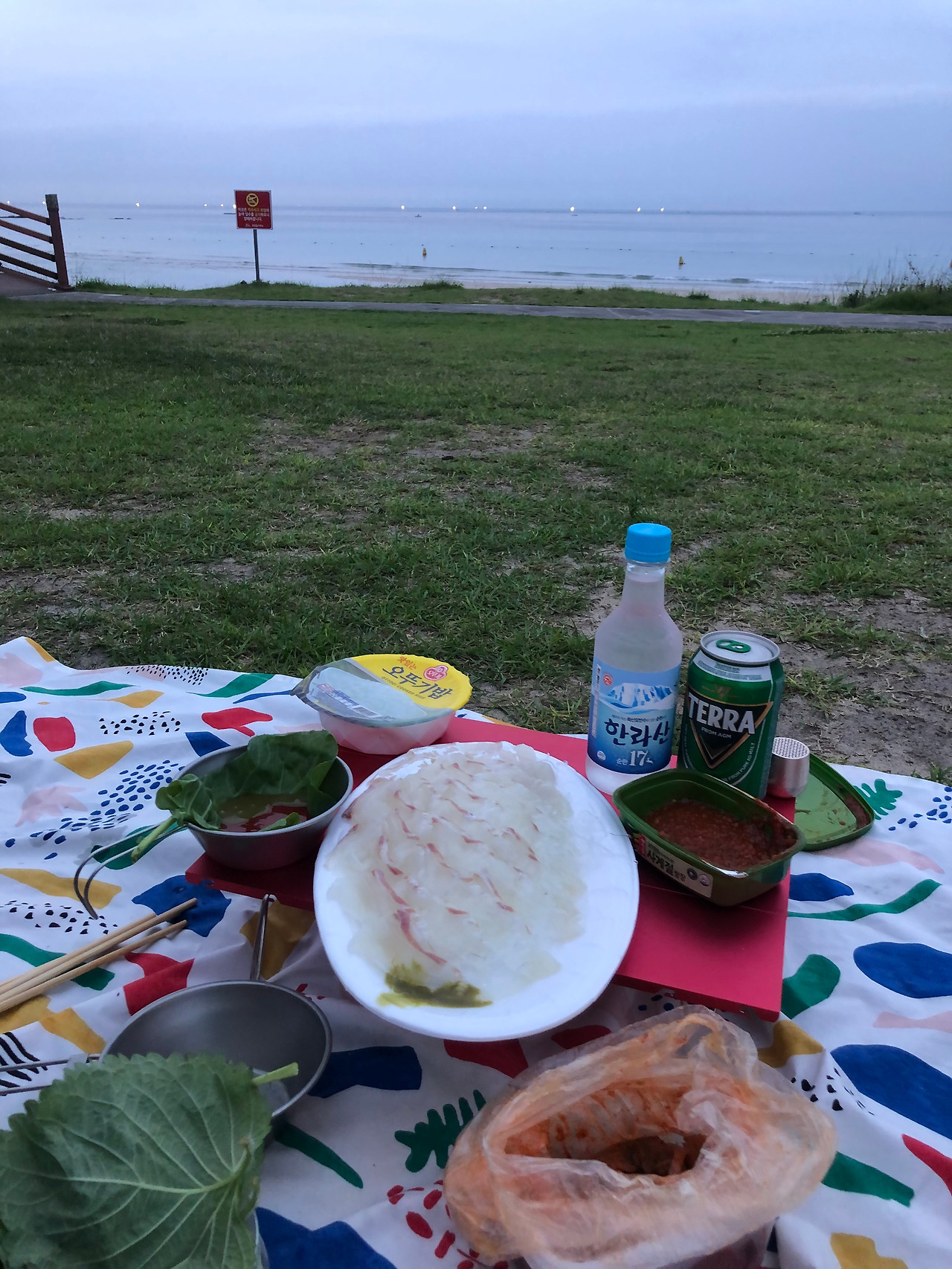 하나로마트에 들러 회와 술을 사고 자리로 돌아왔다. 바다를 보면서 한라산을 한 잔 하니 정말 아-무 것도 부러울 게 없었다. 술도 못하는 우리 둘이 순식간에 기분이 좋아져 10분만에 한라산 한 병을 비워버렸다. 알딸딸하게 딱 기분좋게 취했다. 이 때부터 취한 것 같은데 엄마와 나눈 대화들이 너무 선명했다.