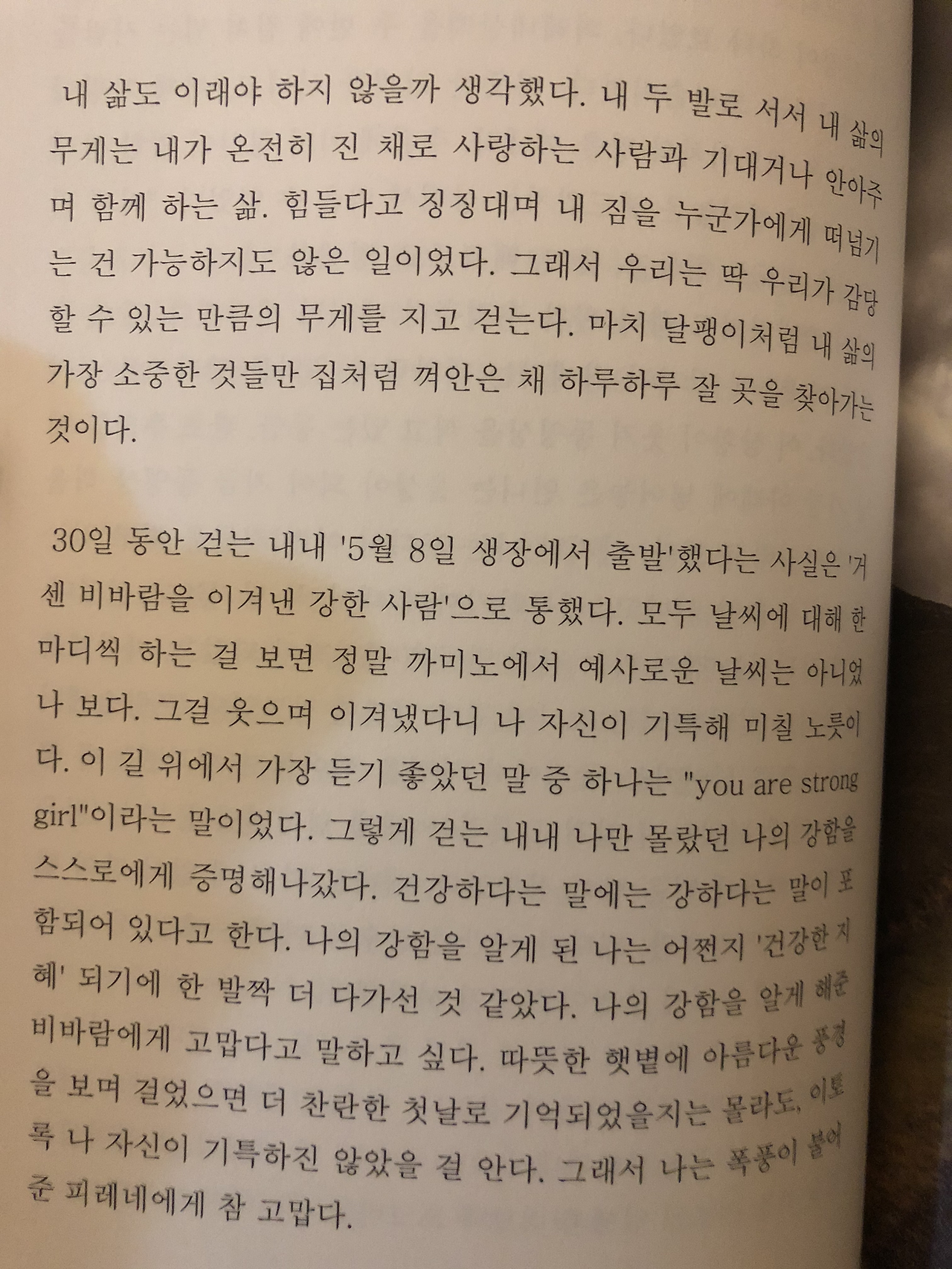 내가 작년의 쓴 호비 레터뿐 아니라 산티아고에 다녀와서 느꼈던 경험들까지 비슷한 감정이 한 두 군데가 아니었다. 내가 메고 있는 배낭의 무게를 삶의 무게로 느끼고, 성취를 쫓던 삶에서 벗어나 여유와 행복을 느끼고, 늘 맑은 날만 있는 건 아니라는 것도. 해보지 않으면 알 수 없다는 것도.