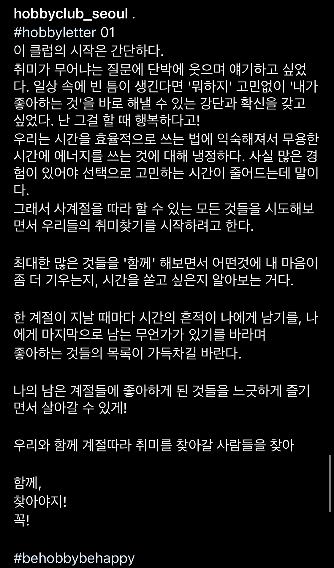 나이 들어서도, 바쁜 일상에서도, 지루한 생활에서도 호비 클럽과 매 계절 취미를 탐험하다 보면 가슴 뛰는 일을, 설레는 일을 자주자주 마주하게 될 것 같다.