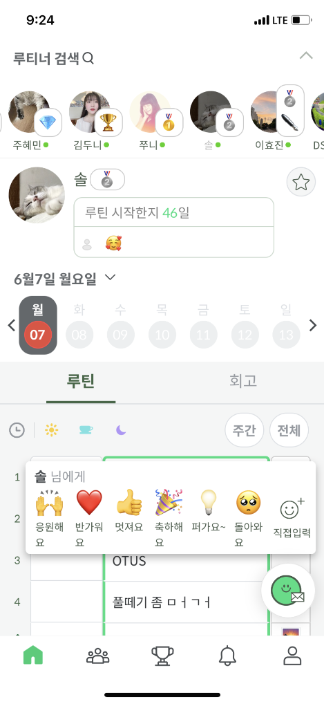 '습관 형성 서비스' 마이루틴은 본인의 루틴을 체크하고, 관리하는 것 뿐만 아니라 유저끼리의 소통도 가능하다. 다른 유저의 습관 목록을 확인하고, 응원을 해주거나 칭찬을 해줄 수도 있다. 응원해요, 퍼가요, 돌아와요 등의 마이루틴 서비스에 맞는 레이블을 더해 서로 동기부여를 해줄 수 있는 구조를 만들었다.