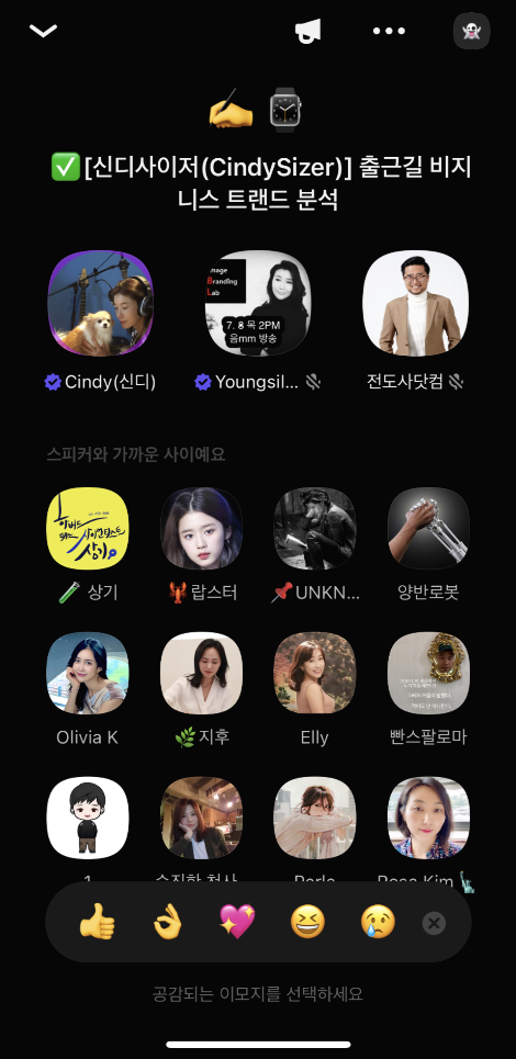 카카오 '음'은 최근 출시된 서비스다. (지금은 식었지만) 압도적이었던 클럽하우스의 행보에 자극을 받아 탄생한 오디오 기반 소셜 서비스다. 클럽하우스와 유사하게 유저들이 생성한 룸에 들어가면 서로 오디오로 소통할 수 있는데 여기에도 '이모지 리액션'이 반영되었다. 인스타 라이브 방송은 '하트'를, 배민의 '라이브 커머스'는 ㅋ 를 날려주는 기능이 있다면, 카카오 '음' 에서는 5가지의 이모지를 날려줄 수 있다. '공감되는 이모지를 선택해주세요' 라는 문구가 있지만, 이 부분을 조금 더 재밌게 풀어낼 수도 있을 것 같다. 이모지를 터치했을 때 살짝 뻠삥하는 마이크로 인터랙션도 디테일한 부분이다.