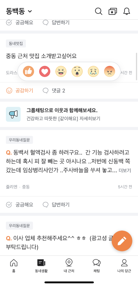 당근마켓은 '동네생활'이라는 커뮤니티 메뉴가 있다. 커뮤니티의 핵심은 곧 '공감'. 콘텐츠 등록 유형에 따라 '우리동네질문'과 '관심주제' 항목으로 구분되는데, '관심주제' 카테고리에서 게시글을 등록했다면 '공감하기'라는 퀵액션이 가능하다. 6가지 공감액션 중 1가지만 선택 가능하다.