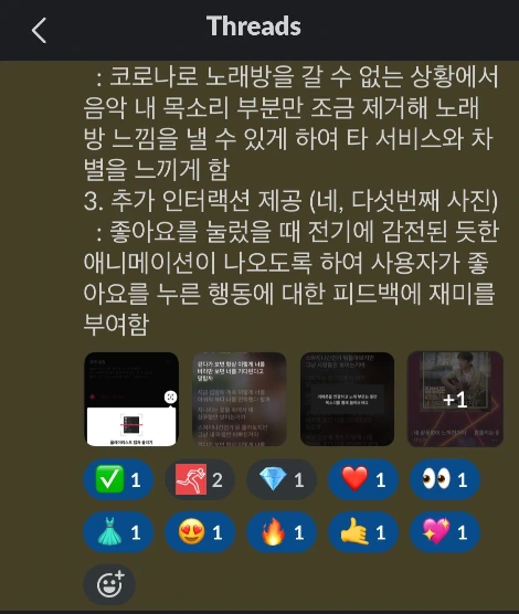 이모지 리액션은 특히 앱 서비스내에서 유저간 네트워킹이 필요한 커뮤니티에서 강력한 효과를 낸다고 생각한다.