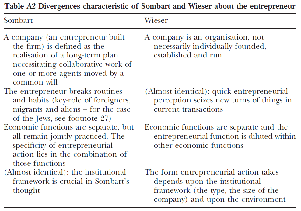 *31) 이를 통해 우리는 유사점과 차이점을 지적하기 위해 부록, 즉 표 A1과 A2를 그릴 수 있었다. Campagnolo and Vivel(2011)도 참조하시오. 표 A2에서 표의 회색 셀은 실제로 분기가 실제로 존재하지 않는 셀이다. 이러한 관점에서, 우리는 실제로 Sombart, Wieser 및 Schumpeter에 따라 기업가의 일종의 펜 초상화 모음으로 끝난다 (마르크스, Rau 또는 Roscher에 대해 달리 할 수 있었던 것처럼). 슘페터가 그 문제에 대해 좀바르트와 마르크스에 대해 잘 말한 것처럼 각 저자는 자신의 이론과 스타일을 가지고 있다[...] 자본의 논리에서 피착취자와 함께 착취자 – 좀바르트에서 인간은 자본보다 우선한다. 그리고 마르크스의 본질, 즉 좀바르트의 비교적 부수적인 것' (Schumpeter 1927: 238, 우리 번역).