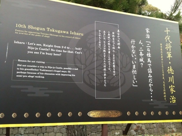 3) 네째날 니죠성 앞의 쇼군들과 니죠성의 인연을 터치한 게시물 중의 하나입니다. 장기에 탐닉한 10대 쇼군 이에하루는 말합니다. 장기를 두면서, 니죠성? 가지 못하네... 내가 바쁜 것 안보여? ^^