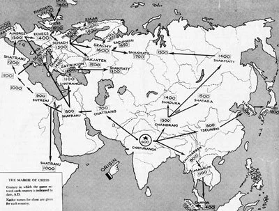 더 거슬러 올라가면, D그림은 차투랑가가 그 대국판으로 사용한 아슈타파다 판이다. 아슈타파다란 동명의 경주게임(우리의 윷놀이와 같은 Race Board Game)을 즐기는 말판이었는데, 체스의 원형인 차투랑가(2인 및 4인)가 두어지던 바로 그 판이다. 여기에도 ×표시가 있는데, 아슈타파다(경주게임)에서는 옥좌(King's Throne)라 하여, 특수한 게임 규칙이 적용되는 곳이다. 4인 차투랑가에서도 4개 진영의 각 왕(Raja)이 이 들 ×표시가 된 옥좌 중의 한 곳에 자리한다.