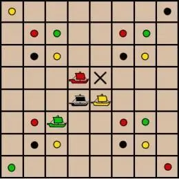 In a free-for-all game you can take any other player's piece by simply moving into its square, exactly like in Chess. However, the ships have another way of taking opponents and that is by "concourse of shipping." If your ship enters the square bordered by three other ships you take them all. While this rarely happens, it is a very powerful move that can change the direction of the game.
