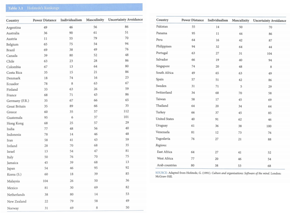개인주의-집단주의는 사회 구성원의 자기 정체성이 개인의 특성에 또는 개인이 영구적으로 속한 집단의 특성에 의존하는 정도 그리고 개인의 관심이나 집단의 관심이 지배하는 정도이. 사람들은 개인주의 사회와 집단주의 사회 모두에서 집단으로 함께 즐겁게 잘 일할 수 있지만, 집단주의 사회는 개인주의 사회보다 내집단과 외집단 간을 더 예리하고 더 영속적으로 구분한다. 권력 거리는 한 사회에서 권력 차이가 수용되고 인가되는 정도를 나타낸다. 불확실성 회피는 불확실성을 줄이고 안정성을 창출하는 방법에 초점을 맞추는 정도이다. 확률이 확실한 우연한 게임의 위험성과는 달리, 불확실성을 받아들이는 것은 알려진 확률에 근거하지 않고 행동하는 것에 익숙하다는 것을 의미한다. 남성성-여성성은 야망, 획득 및 성취의 전통적 남성 지향이 양육, 개인 간의 조화와 같은 전통적 여성 지향에 대해 강조되는 정도를 나타낸다. 40개국에 각각 4차원의 0에서 100까지의 점수를 부여함으로써 Hofstede는 국가 문화의 분류를 도출했다. 원본 표본은 나중에 53개국 및 세계 지역으로 확대되었다. 국가별 점수는 표 3.1과 같다. 최근에 Hofstede, Hofstede & Minkov (2010)는 73개국의 점수를 제공하는 IBM의 연구 이후 후속 연구를 통해 이러한 점수를 갱신했다. 다른 학자들은 문화와 관련된 경제 상황에 대한 IBM의 연구(Tang & Koveos, 2008) 이래로 변경 사항을 조정함으로써 점수를 세련되게 하는 방법을 제안한다.
