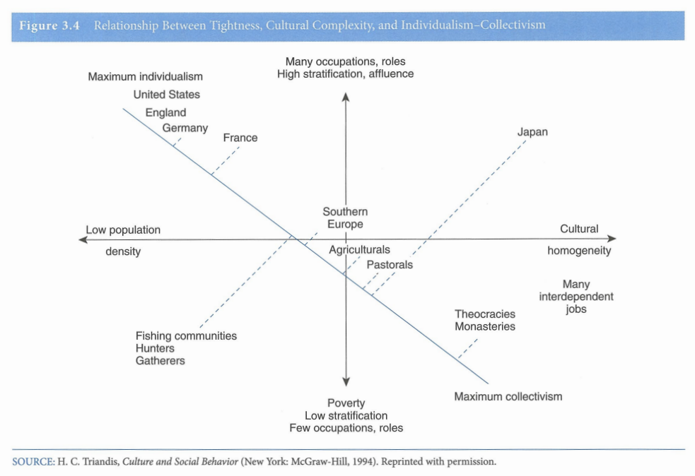 일본은 긴장 문화의 예이며, 반면에 미국은 이완 문화의 예이다(예를 들어 Chan et al., 1996 참조). 긴장성은 또한 인구 밀도가 높은 균질 문화와 관련이 있다. 또는 이완 문화는 종종 적절한 행동에 대해 여러 가지, 때로는 모순되는 규범을 가지고 있다. 문화가 긴장적거나 이완적인 것으로 특징지어지기는 하지만, 다른 맥락에서 사회에서 긴장성과 이완성이 모두 발생할 수 있다(Triandis, 1995). 예를 들어, 어떤 문화는 정치적 측면에서 긴장할 수 있지만 종교 측면에서는 이완할 수 있다. 문화적 복잡성은 개인의 삶의 다양한 영역에서 분화의 양을 의미한다. 개인이 사용할 수 있는 다양한 역할의 수, 지역 사회의 규모, 한 국가의 1인당 GNP는 문화적 복잡성을 측정하는 지표로 제시된다. 예를 들어, 수렵채집 사회는 표현된 수천 개의 다른 가능한 역할을 가진 현대 사회보다 덜 복잡하다. 긴장성, 복잡성 및 개인주의-집단주의 간 제안된 관계는 그림 3.4에 제시되어 있다. 그림 3.4에서 제시된 바와 같이, 집단주의는 이스라엘의 키부츠와 북아메리카의 Amish의 하위 문화에서 발견될 수 있는 것과 같이 긴장되고 단순한 문화에서 최대화되는 반면, 대도시인 프랑스와 미국과 같은 이완된 복잡한 문화에서는 개인주의가 최대화된다.