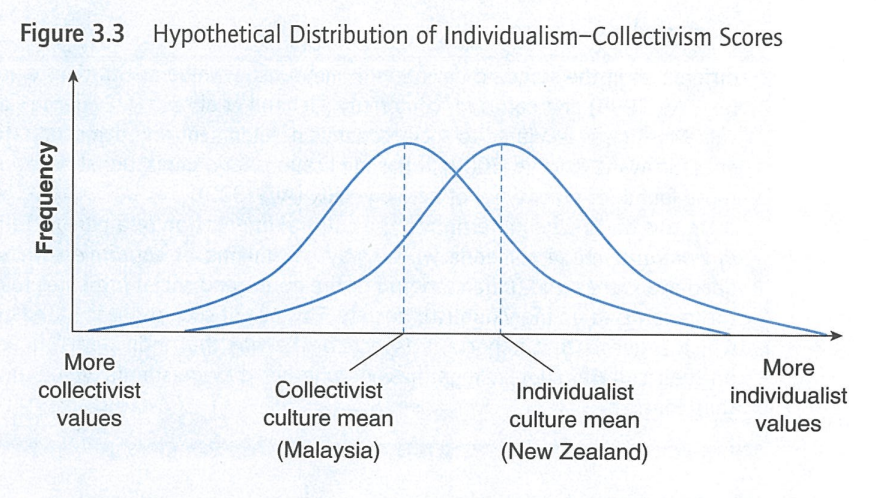 사회 문화가 사회 구성원이 친밀하게 알고 있는 맥락을 반영한다고 강조하는 것이 특히 중요하지만, 개인이 선호하는 가치를 반영하지는 않는다. 이 장에서 논의된 모든 문화 차원 점수는 각 문화 집단의 모든 참가자에 대한 일련의 질문에 대한 평균 점수를 기반으로 한다. 따라서 두 나라가 특정 가치에 대한 설문조사 질문에서 다른 평균 점수를 가지고 있기 때문에 그 나라의 두 개인이 같은 방식으로 다를 것이라고 추론하는 것은 적절하지 않다. 즉, 각 국가 내에서 개인은 자신의 사회 문화적 지향의 다양한 측면에 대해 얼마나 동의하고 좋아하고 지지하는지에 따라 상당히 다르다. 예를 들어, 다음 그림은 집단주의 국가(말레이시아)와 개인주의 국가(뉴질랜드)에서 개인주의-집단주의의 특정 측면을 얼마나 소중하게 생각하는지에 대한 개인들의 점수 간의 가설적 중첩을 보여준다.