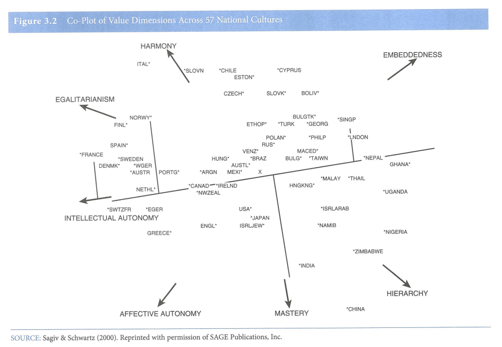 이 국가 문화의 이러한 차원을 정의한 후, 그들은 계속해서 이 가치 프로파일에 57개국의 표본을 비교했다. 그런 다음 co-plot이라는 기술을 사용하여 표본에 있는 모든 국가 쌍 간의 차이점에 대한 프로파일을 만들었다. 이 절차는 모든 7차원에서 동시에 국가 간의 상호관계에 대한 2차원 그래픽 표현을 생성한다(Sagiv & Schwartz, 2000 참조). 교사 표본의 비교 예가 그림 3.2에 나와있다.