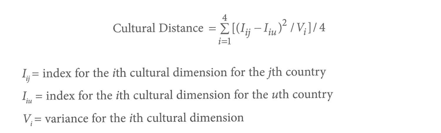 문화적 차원의 정량적 척도의 장점 중 하나는 국가 간 문화 거리의 지수를 구성하는 능력이다. 이러한 종류의 지수는 국가 문화가 측정된 가치 지향성에 기초하여 서로간 얼마나 문화적으로 다른지를 고려하기 위해 물리적 거리의 유추를 그린다. 예를 들어, Hofstede의 네 가지 문화 척도를 측정하여 국가 문화 거리의 복합 지수가 개발되었다 (Kogut & Singh, 1988). 지수는 각 차원의 편차에 대한 차이를 보정한 다음 산술 평균했다. 지수의 대수 공식은 다음과 같다.