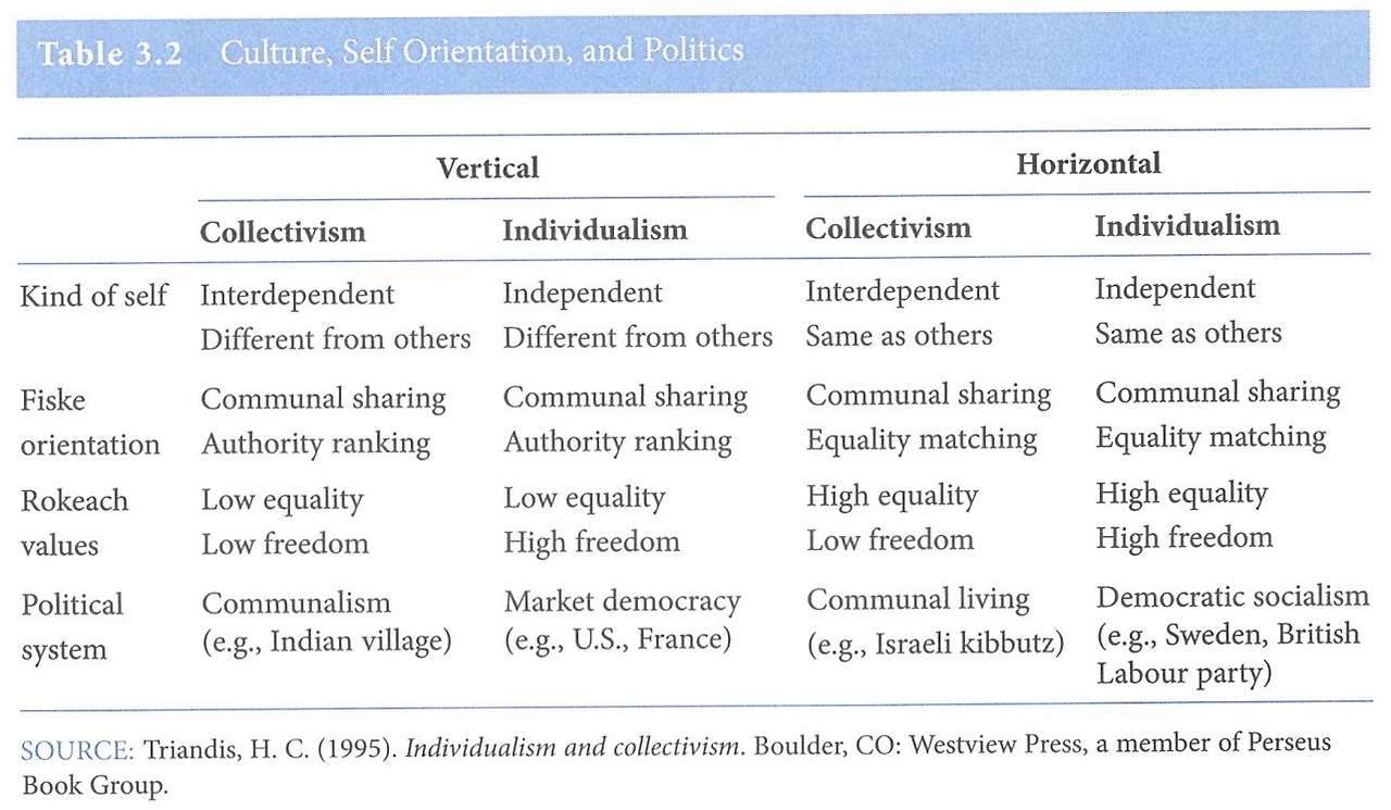 표 3.2는 수직적이고 수평적인 개인주의와 집단주의의 이러한 다른 조합이 사회가 그들의 구성원을 보는 방식, Rokeach(1973) 차원 상 그들의 가치 지향, 그들의 지배적 정치 체계 및 Fiske(1990)에 의해 정의된 그들의 전형적 사회적 패턴과 어떻게 상응하는지를 보여준다. 표 3.2에서 볼 수 있듯이 수직적이고 수평적인 개인주의와 집단주의 간의 이러한 구분은 네 가지 다른 문화적 프로파일 또는 증후군을 초래한다. 그렇지만 권력 거리와 집단주의 간의 상관관계(Hofstede, 1980에 따르면 r = 0.67에서)는 수직적 집단주의와 수평적 개인주의가 전 세계적으로 지배적인 문화적 특성일 수 있음을 시사한다 (Triandis 1995).