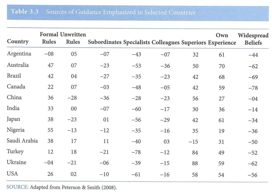 표 3.3에 나와 있듯이, 자기경험(own experience) 열의 양수는 거의 모든 곳에서 관리자가 자신의 경험과 훈련에 가장 많이 의존한다는 것을 의미한다. 널리 퍼진 신념(widespread beliefs) 열의 음수는 업무 상황을 다루기 위해 사회의 규범(또는 널리 퍼진 신념)에 가장 덜 의존한다고 관리자가 보고함을 나타낸다. 이러한 전반적인 추세에도 불구하고, 표 3.3에서 볼 수 있듯이 사회들은 관리자가 이러한 모든 지침 원천에 대해 부여한다고 말하는 상대적인 강조에서 광범위하게 차이가 있다. 예를 들어, 나이지리아의 관리자는 목록의 다른 국가의 관리자가 하는 것보다 지침의 다른 원천에 상대적으로 그들의 조직의 규칙과 절차를 더 많이 사용한다고 보고한다. 규칙을 가장 무겁게 사용하는 국가들은 관리자가 때로는 규칙의 품질과 책임성을 향상시키기 위해 작업하고, 다른 경우에는 규칙을 우회하는 방법을 찾기 위해 부지런히 노력하는 많은 국가들이 포함된다. 이러한 역동성은 규칙을 무겁게 사용하는 것이 업무 상황이 얼마나 잘 처리되는지에 대한 관리자의 평가와 관련이 있는지 여부에 있어 국가들 간 문화적 차이를 생산한다 (Smith et al., 2011). 국가 수준에서는 상사에 의존하는 것과 규칙에 의존하는 것에 관한 질문은 서로 긍정적인 상관 관계가 있으며 자기자신에게 의존하는 것과 부하에 의존하는 것에 관한 질문은 서로 부정적인 상관 관계가 있다. 이러한 적당한 상관 관계에 의해 뒷받침되어 이 4가지 척도는 때때로 지침의 수직적 원천의 활용의 전반적인 척도로 결합되었다 (Smith, Peterson, & Schwartz, 2002).