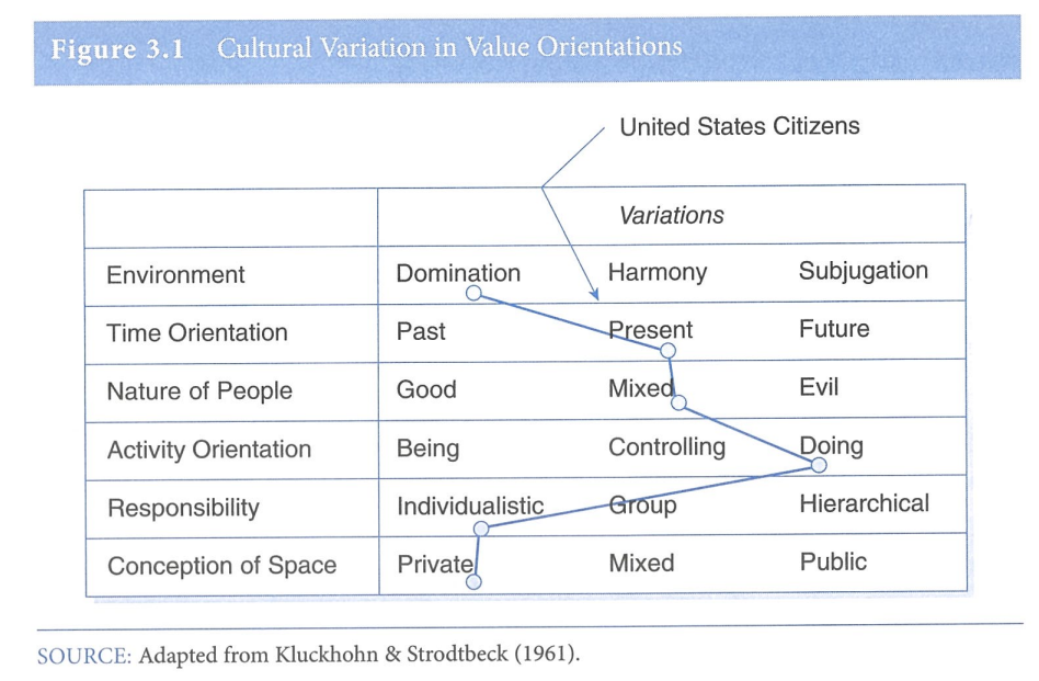 비교 인류학의 초기 연구는 사회가 문화적 해결책을 찾아야 하는 문제를 확인하기 위한 프레임워크를 만든다(Inkeles & Levinson, 1969, Malinowski, 1939). 경영 문헌이 문화적 다양성을 개념화한 방식에 중대한 영향을 미쳤던 한 가지 프레임워크은 모든 사회가 직면하는 여섯 가지 문제를 식별하여 개념화한 것이다(Kluckhohn & Strodtbeck, 1961; Maznevski, DiStefano, & Nason, 1993). 사회는 이러한 각 문제를 다루는 세 가지 대안 방법에 다른 강조점을 두고 있다.