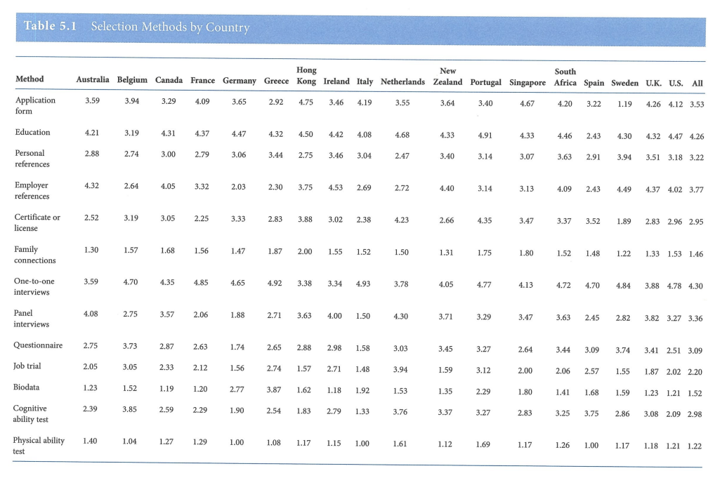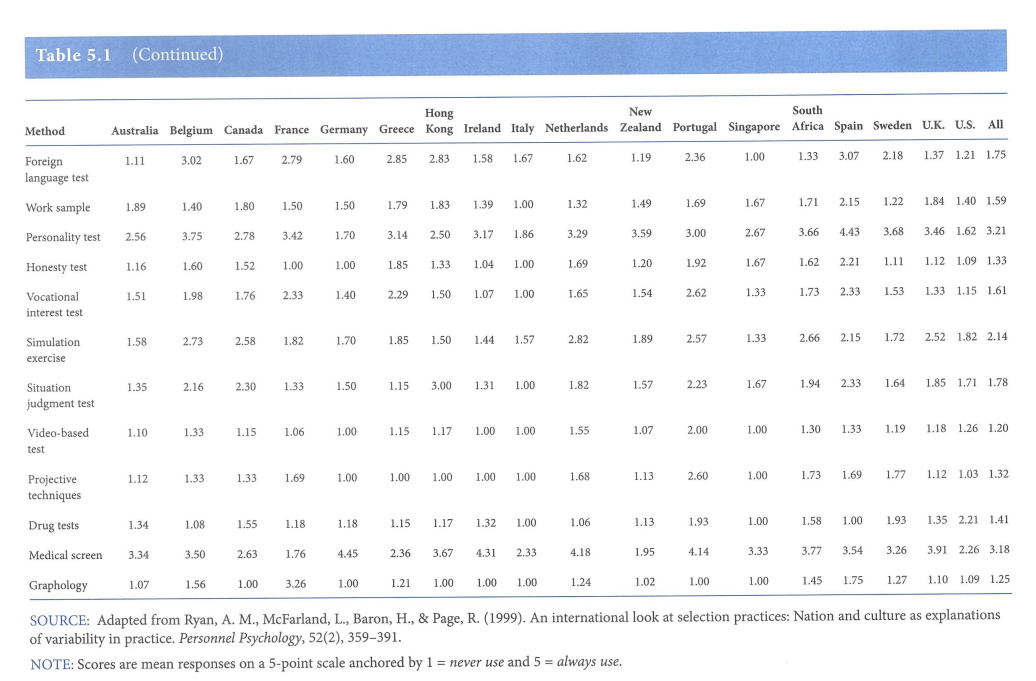 다문화 간 상호 작용 측면에서 관련된 두 가지 일반적인 관리적 판단은 직원 선택과 보상 할당이다. 모든 조직은 신규 회원을 모집하고 선택해야 한다. 이전 논의를 기반으로, 이 중요한 의사 결정 활동을 수행하는 데 사용되는 절차에 있어서 전세계적으로 상당한 차이가 있을 것으로 예상된다. 다른 문화권의 선발절차에 대한 연구는 아직 완료되지 않았지만, 의사 결정 과정에서 체계적인 차이가 있음을 보여준다. 예를 들어, 20개국 959개사의 선발 과정에 대한 조사에서 사용된 선발 절차에서 상당한 유사점과 차이점의 패턴이 발견되었다 (Ryan, McFarland, Baron, & Page, 1999). 표 5.1은 회사가 특정 기법을 사용한 정도를 l = 전혀 없음에서 5 = 항상 또는 거의 항상까지의 척도로 보고한다.