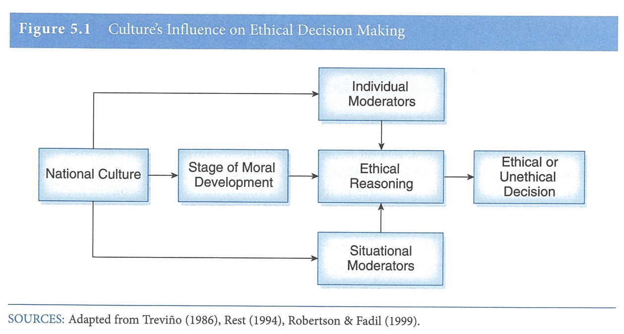 관리자의 인지적 도덕 발달 단계는 옳고 그름을 결정하는 정신적 과정을 결정하며, 이전에 언급했듯이 이러한 도덕 발달 단계은 모든 문화권에서 (균일하지는 않을지라도 [Snarey, 1985]) 존재하는 것으로 보인다 (Snarey, 1985). 그러나 개인적인 요인과 상황적 요인 모두 조직에서 옳고 그름을 평가하는 것과 실제 윤리적 의사 결정 간의 관계에 영향을 미칠 수 있는 잠재력이 있다 (Trevino, 1986). 윤리적 의사 결정 과정에는 문제의 윤리적 본질 식별, 윤리적 판단 내리기, 윤리적 의도 확립, 도덕적 행동 참여의 네 가지 단계가 포함된다. 또한 개인적 차이와 상황적 차이, 그리고 의사 결정 과정은 문화에 따라 달라질 수 있다 (Thorne & Saunders, 2002). 그림 5.1은 이 진행과정의 그래픽 표현이다.