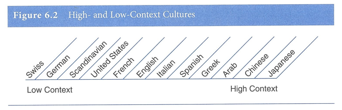 관찰을 근거로, 여러 국가가 그들이 주로 고맥락인지 저맥락인지에 따라 연속적으로 분류되었다 (Hall, 1976). 저맥락 문화에서 메시지는 대개 발화된 말로 전달된다. 고맥락 문화에서는 의미의 상당 부분이 암묵적이고, 말은 메시지의 작은 부분만 전달한다. 수신자는 발화자, 배경, 또는 다른 맥락 단서에 대한 과거의 지식으로부터 그 틈을 메워야 한다. 그림 6.2는 고맥락과 저맥락의 연속체에 따라 12개국의 관계를 보여준다.