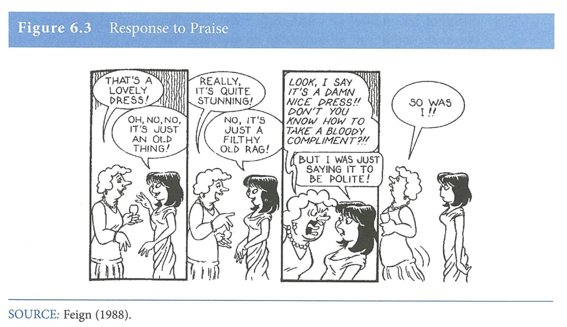 문화와 체계적인 관계가 있는 또 하나의 스타일 요소는 칭찬의 사용과 칭찬에 대한 반응이다 (Triandis, 1978). 몇 가지 비교 연구는 칭찬을 주고 받는 것에 대해 스타일 차이를 전시한다. 문화적 차이는 칭찬이 사용되는 빈도, 칭찬 대상, 사람들이 반응하는 방식에 대한 것이다. 예를 들어, 미국 사람은 칭찬을 더 자주 사용하고, 친구나 가족 등 가까운 사람을 칭찬하는 경향이 더 있는 반면, 일본인은 낯선 사람을 더 칭찬하는 경향이 있다 (Barnlund & Araki, 1985). 또한 미국인들은 신체적 외모를 칭찬하는 경향이 있지만, 아랍인은, 일본인처럼 신체적 특징보다는 기술과 업무를 칭찬하는 경향이 있다 (Nelson, El Bakary, & Al Batal 1993). 그러나 과장 경향과 일치하여 아랍의 칭찬은 일반적으로 더 정교하며, 종종 은유를 포함한다. 칭찬에 대한 반응도 문화에 따라 다를 수 있다. 겸손이 덕목인 중국과 같은 문화에서 칭찬은 당혹감을 일으킬 수도 있다. 예를 들어, 홍콩 중국인은 칭찬을 비껴가는 경향이 있지만, 반면에 영국인들은 그것을 정중하게 받아들이는 경향이 있다 (Loh, 1993). 그림 6.3의 카툰은 한 사례를 제공한다.
