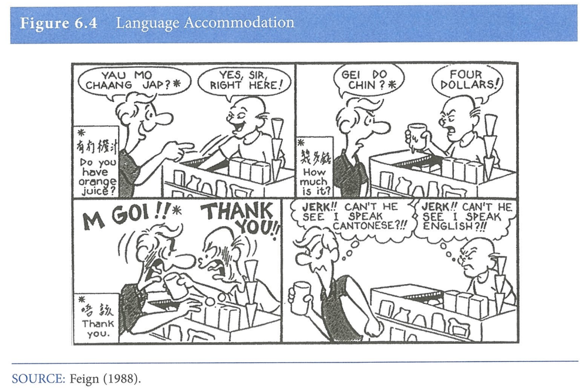 제 2 언어 사용은 다문화 의사소통에 많은 함의를 가진다. 첫째, 제 2 언어를 사용하는 것은 인 인지적 부담을 만든다 (Smith & Bond, 1999). 제 2 언어 사용자는 이미 다른 의사소통 요구사항이나 현재 과제와 씨름하고 있을 수 있으므로, 더 많은 노력이 필요하다. 장시간 제 2 언어 사용은 사람을 지치게 만든다. 둘째, 제 2 언어 화자의 유창성이 높을수록, 그들은 다른 면에서 유능하다고 여겨질 가능성이 높다 (Hui & Cheng, 1987). 셋째, 언어간 상호작용에서 제1언어 사용자는 말하는 속도를 늦추고 문장의 복잡성을 줄이는 등, 상대의 언어적 역량이 낮으면 말하는 측면을 수정하는 경향이 있다 (Gass & Varonis 1985). 이러한 말의 단순화는 내용의 중복성을 제거하여 의사소통을 개선할 수 있다 (Giles & Smith, 1979). 그러나 외국인 말하기라고 불리는 이런 유형의 언어조절은 은근한 모욕으로 여겨질 수 있으며, 잘 받아 들여지지 않을 수도 있다 (Williams, Garrett, & Tennant, 2004). 상자 6.2은 외국인 말하기로 전락하는 대화의 예이다.
