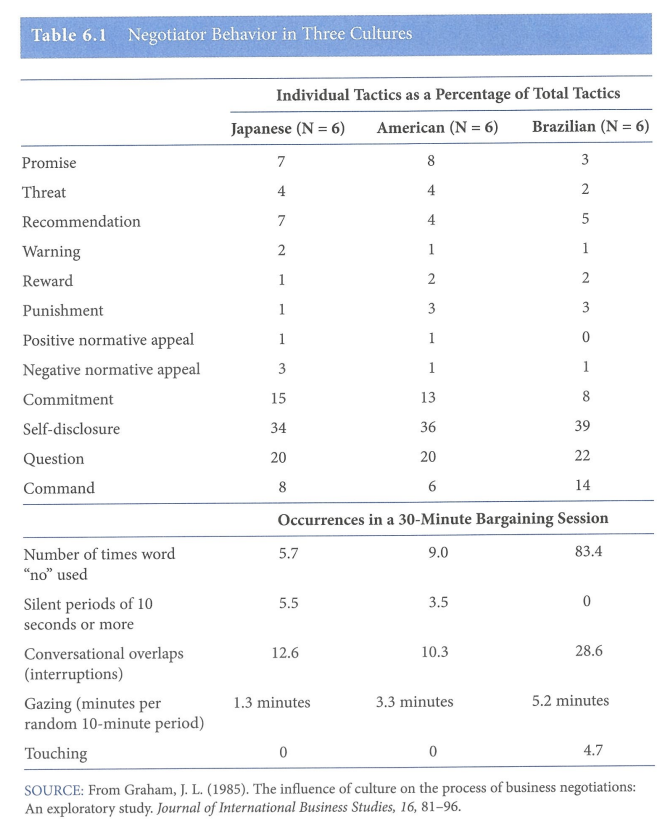 Graham과 그의 동료에 의한 일련의 연구(Graham, 1983,1985; Graham, Kim, Lin, & Robinson, 1988; Graham, Mintu, & Rodgers, 1994)는 여러 다른 국가의 협상가들이 사용하는 전술의 차이를 문서화했다. 예를 들어, 일본, 미국 및 브라질 협상가의 언어적, 비언어적 행동의 차이는 표 6.1에 나와 있다.