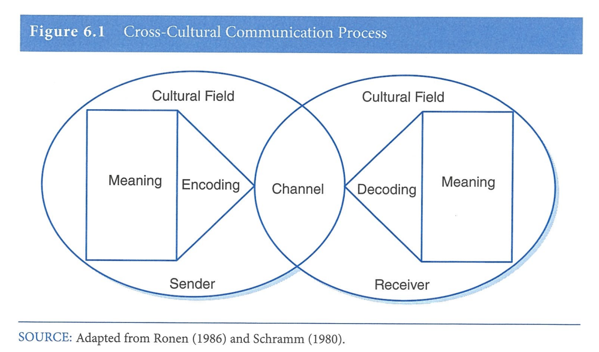 다문화 의사소통은 단일 문화 의사소통보다 훨씬 더 까다로운데, 왜냐하면 문화적으로 다른 개인들은 공통된 정보가 적기 때문이다. 그들은 공통의 바탕이 적은데, 왜냐하면 그들의 경험 분야에서의 차이 때문이다 (Ronen 1986; Schramm, 1980). 이 장에서는 문화 분야라는 용어는 의사 소통에 영향을 미치는 개인의 배경(예: 교육, 가치관, 태도)의 문화 기반 요소를 참조한다. 이것이 기본 의사소통 프로세스에 더하는 추가 복잡성은 그림 6.1에 그래프로 표시되어 있다.