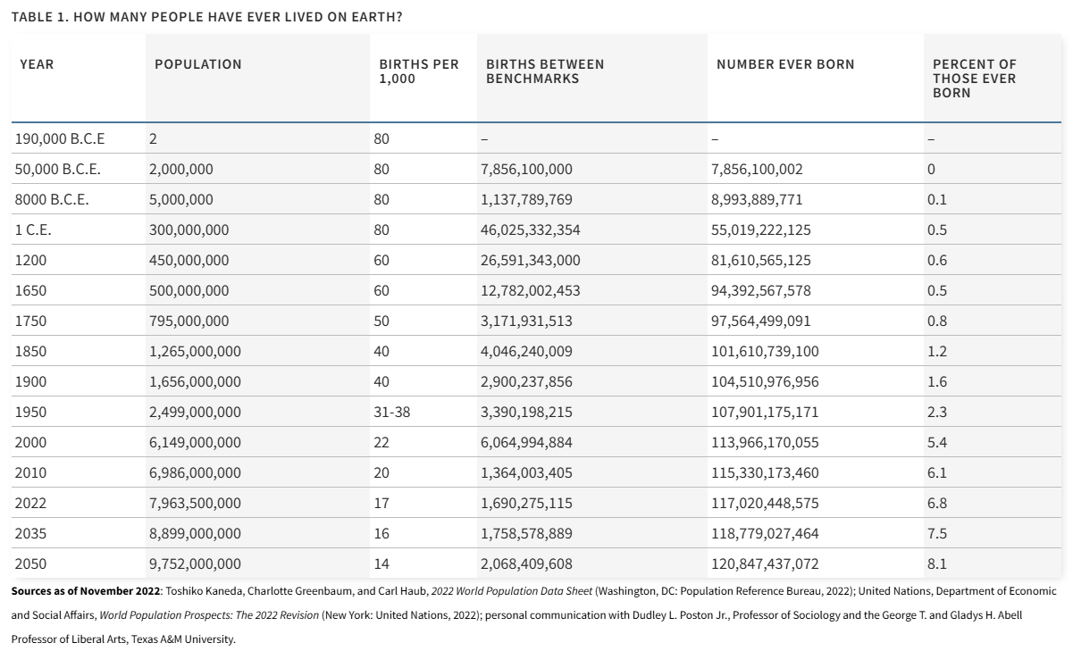 다음 내용은 prb.org/articles/에 나오는 내용이다. 나는 인류 역사상 영혼의 수를 알고 싶었는데... 챗선생이 나에게 이 사이트를 알려주었다. 이 사이트에 따르면, 2022년까지 지구상에서 태어난 인류의 수는 약 1,170억명이다.