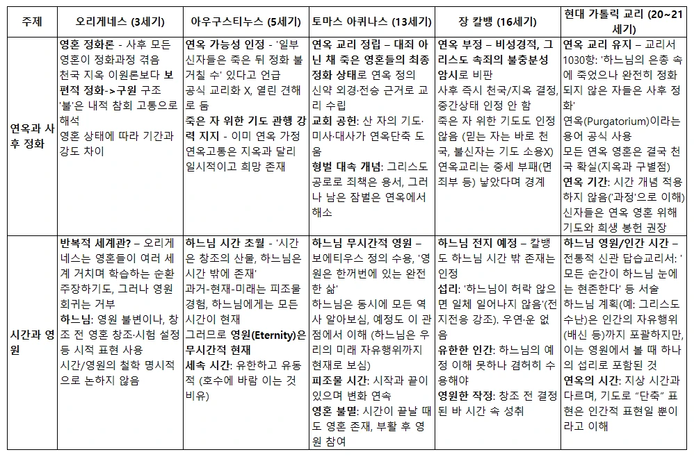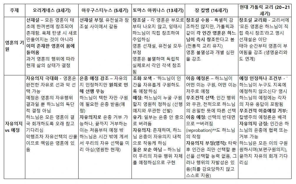 아래 표는 앞서 살펴본 오리게네스, 아우구스티누스, 토마스 아퀴나스, 장 칼뱅, 현대 가톨릭 교리의 견해를 주요 주제별로 비교한 것입니다. 이를 통해 시대별 사상의 차이와 공통점을 일목요연하게 파악할 수 있습니다.