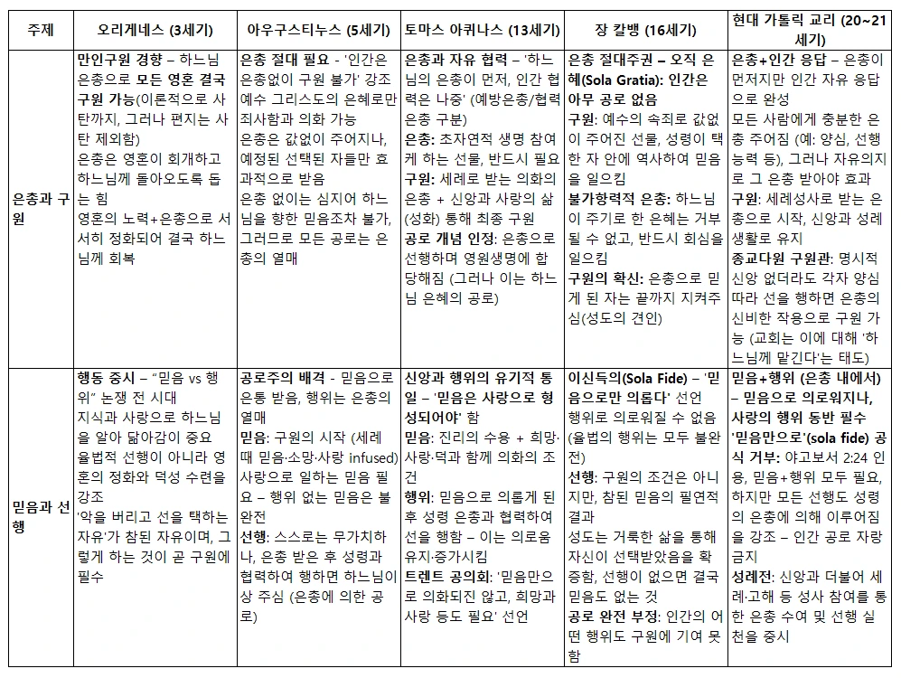 앞서 고대에서 현대까지 다양한 관점에서 구원, 영혼, 은총, 자유의지, 예정론 등에 대한 사상을 살펴보았습니다. 여기서는 이러한 사상들을 종합적으로 비교하고, 전체적인 흐름과 경향성을 논의합니다.