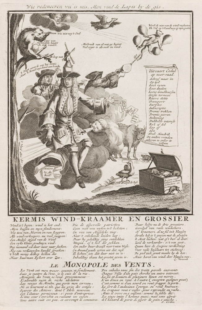 ‘바람의 독점 (Le Monopole des Vents)’이라는 제목의 이 만평은 하늘에서 **바람(실체 없는 자산)*을 쥐고 내려오는 투기광과 빈 궤짝만 남은 현실을 묘사하며, 로의 금융체제가 남긴 허상을 풍자하고 있다.