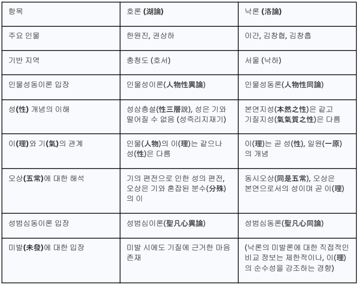 표 1: 호론과 낙론의 핵심 주장 비교