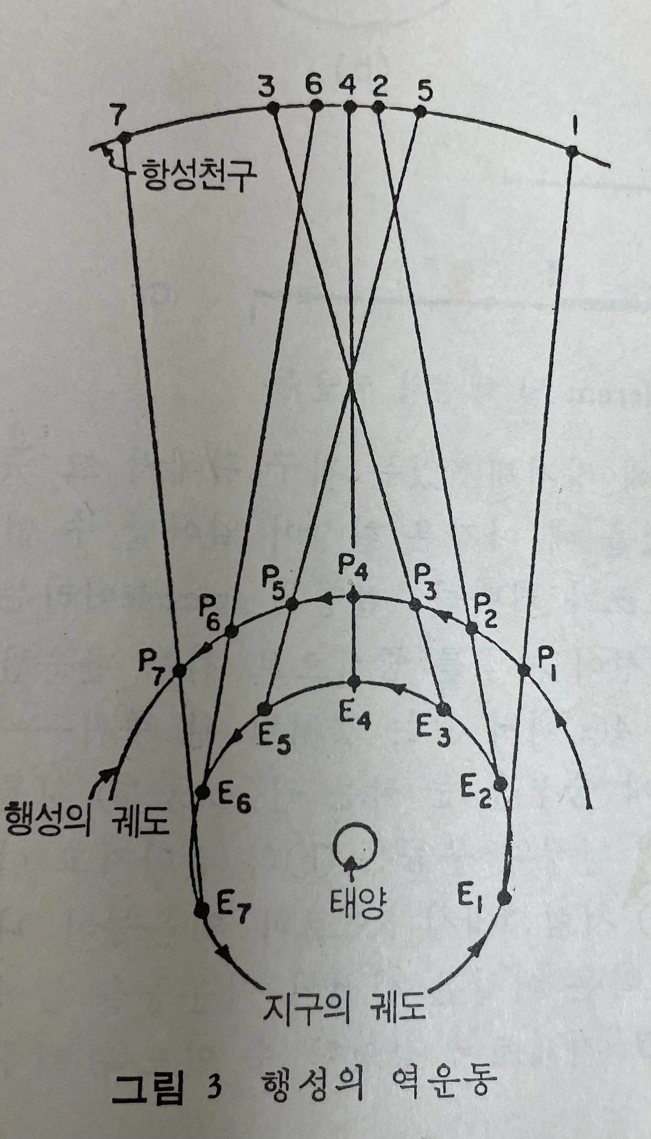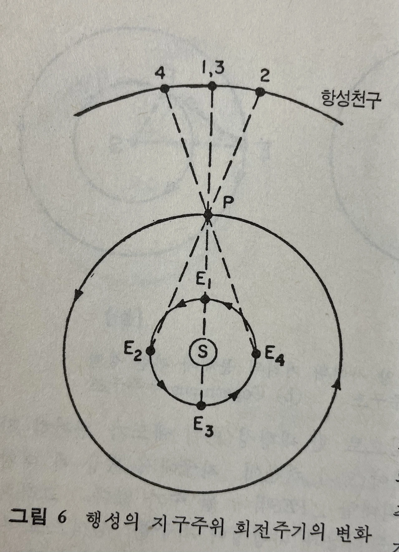25/ 코페르니쿠스의 변혁에 의해 해결이 된 프톨레마이오스 우주구조의 문제점은 비단 이것들만이 아니지만 여기서는 마지막으로 한 가지 예만 더 들기로 하겠다. 지구에서 관측했을 때 행성이 지구 주위를 한 바퀴 도는 주기가 항상 일정하지 않은 것이 그것인데 그림6이 코페르니쿠스 우주구조에서 이를 보여주고 있다...