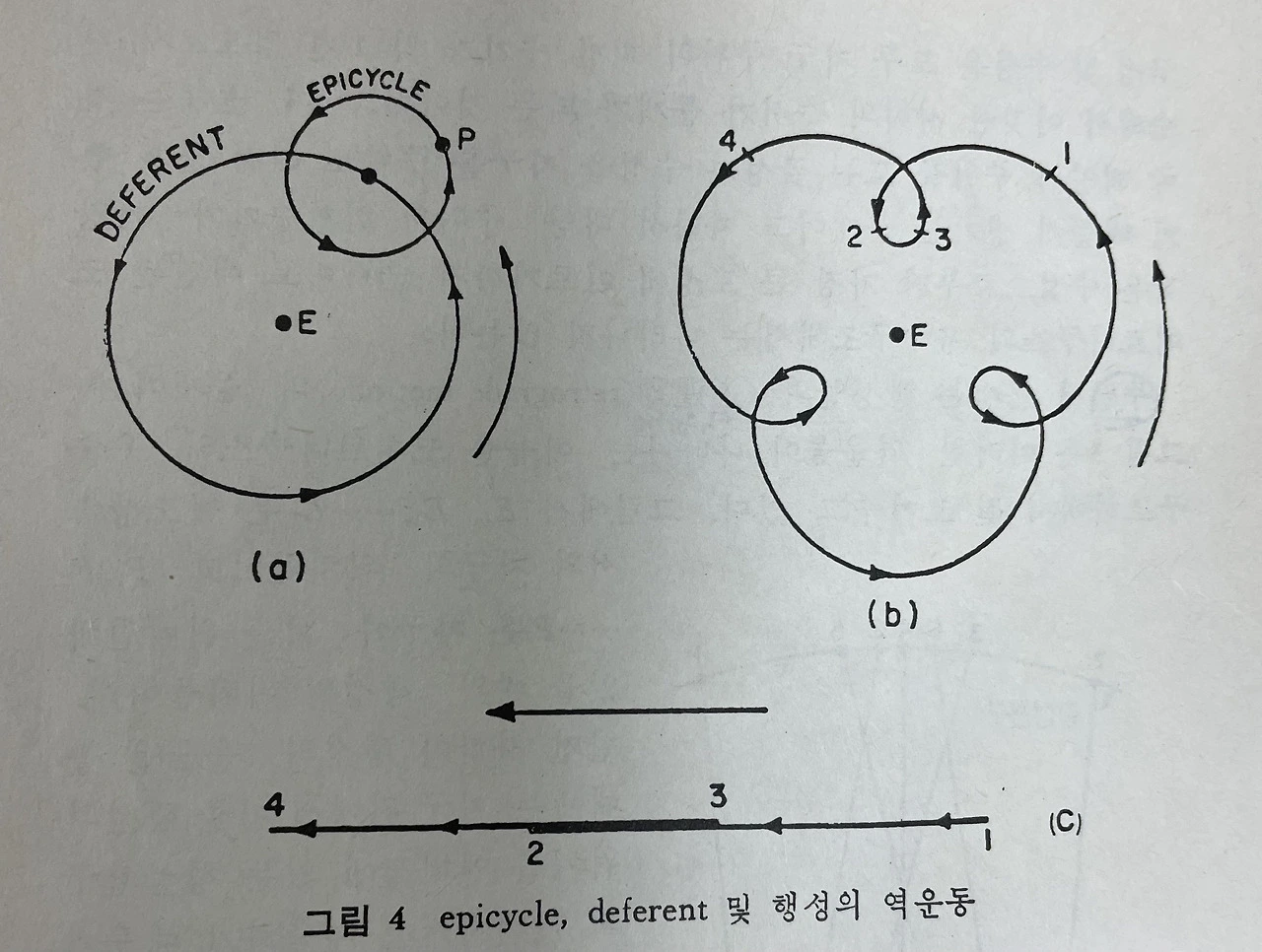 23/ 두번째 문제는 행성들의 <역운동retrograde motion>의 문제이다... 결국 프톨레마이오스가 채택한 설명은 epicycle이라는 것을 사용해서 가능했다. 즉 행성이 지구를 중심으로 하는 단순한 원운동을 하는 것이 아니라 그림 4(a)에서 보는 것처럼 원 주위-이 원을 deferent라고 부른다-에 중심을 둔 작은 원(epicycle) 위를 돈다는 것이다...